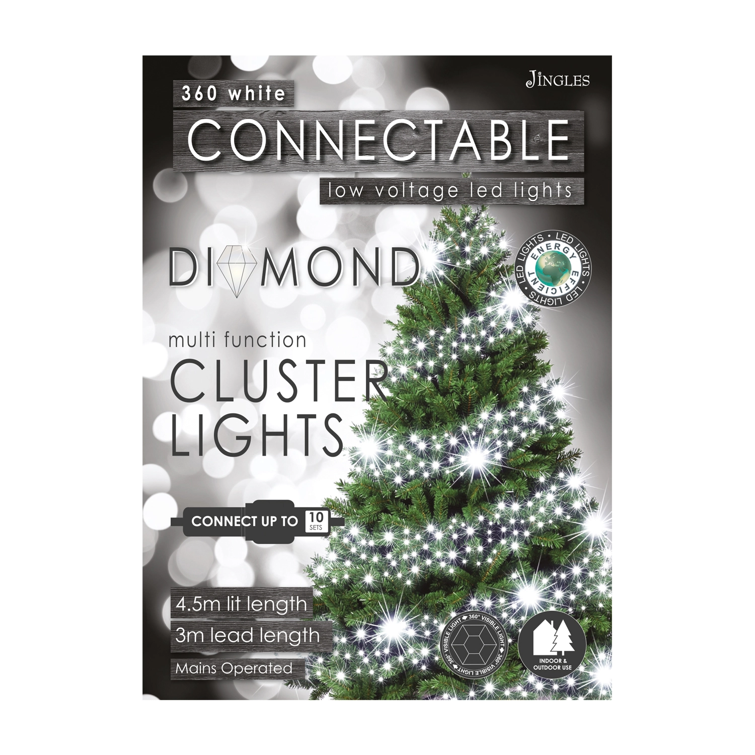 These energy-efficient, connectable lights feature 360 white LED bulbs on a flexible, durable green cable. The set spans a lit length of 4.5 meters with a 3-meter lead wire, making it ideal for indoor and outdoor use. Equipped with an IP44-rated adaptor and 8-function memory settings, this lighting system includes an 8+16-hour timer for hassle-free operation. Connect up to 10 sets for a captivating, seamless display that adds a magical touch to any holiday setup.