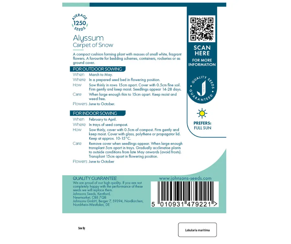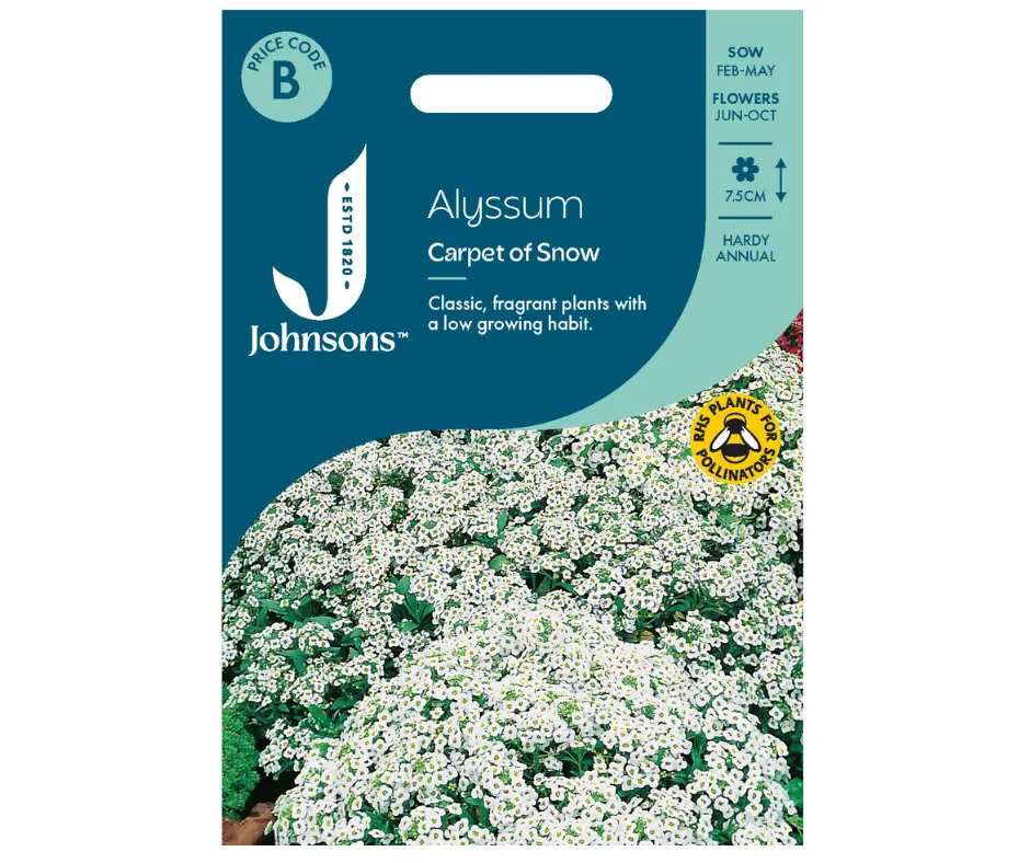 Johnsons Seeds’ Alyssum Carpet of Snow offers eye-catching, fragrant blooms with soft, billowing foliage, perfect for creating a stunning outdoor floral carpet. This half-hardy annual thrives when sown in prepared seed beds from February to May, flowering beautifully from June to October at a height of 12 cm.