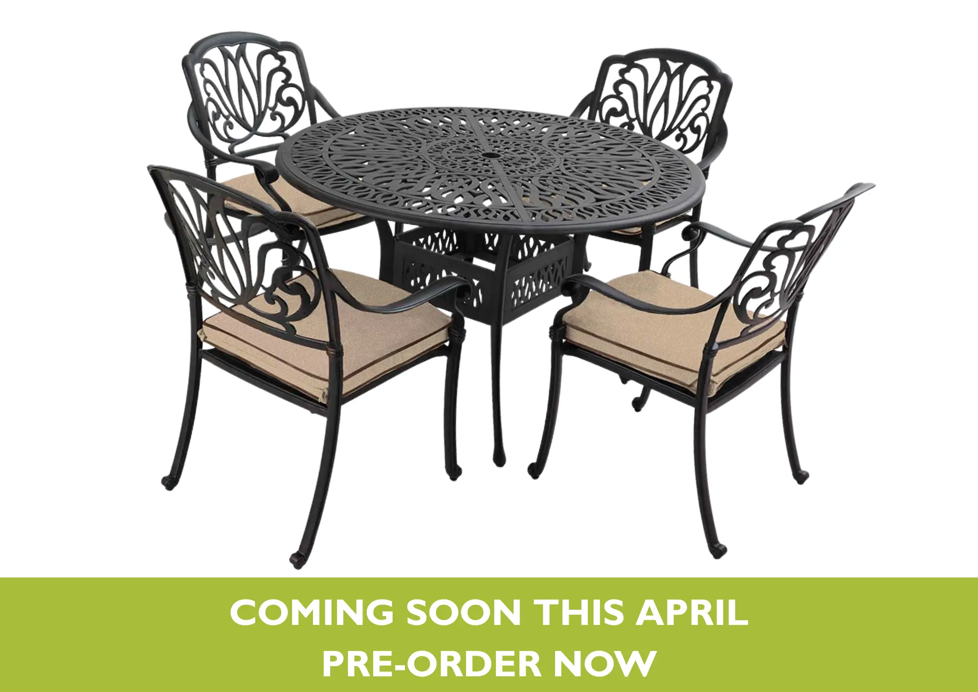 The Amalfi 4 Seat Round Dining Set blends timeless bronze cast aluminium craftsmanship with Weatherready® cushions for low-maintenance, all-season outdoor dining. Complete with a 2.5m UPF50+ round parasol and sturdy 15kg base, this durable, rust-free garden furniture set offers elegant comfort, stackable chairs, and long-lasting style for alfresco entertaining.
