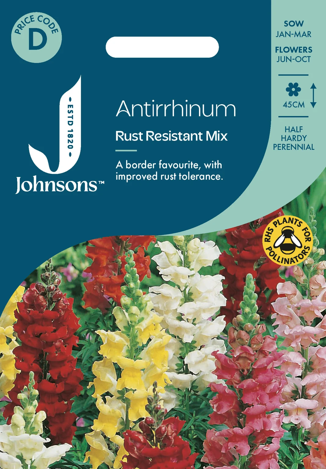 Johnsons Seeds’ Antirrhinum Rust Resistant Mix offers vibrant, long-lasting snapdragon blooms with enhanced rust resistance, perfect for indoor sowing from January to March. These elegant spires flourish in well-prepared trays and transplant easily outdoors by late spring for continuous flowering from June to October.
