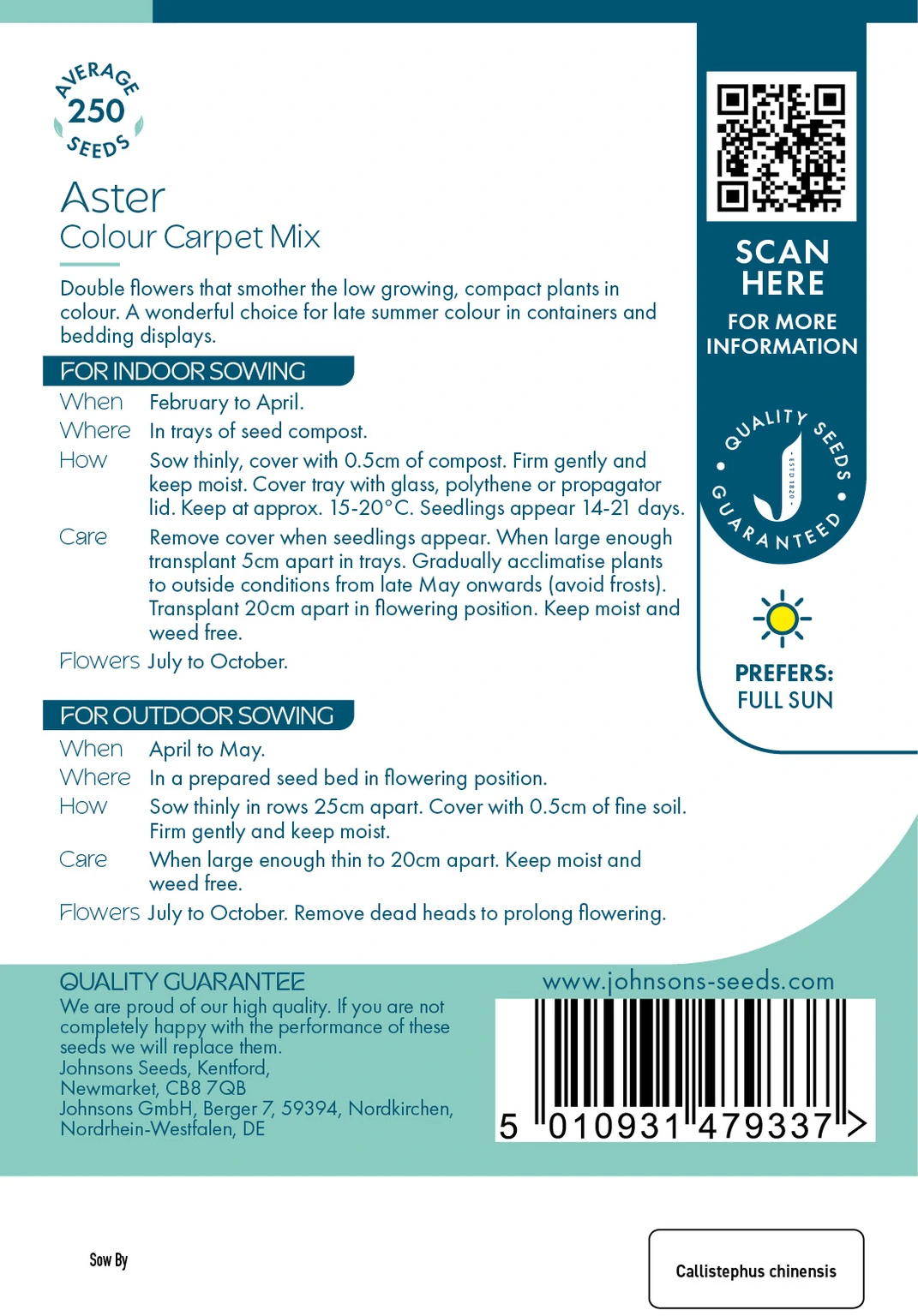 Low-growing Aster Colour Carpet Mix from Johnsons Seeds delivers dense, double blooms that blanket compact plants with vibrant colour from midsummer to autumn. Ideal for containers and bedding displays, this easy-to-grow annual offers reliable impact and long-lasting garden interest.