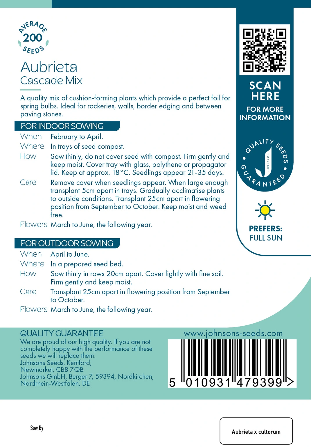 Experience vibrant spring blooms with Johnsons Seeds Aubrieta Cascade Mix—perfect for rockeries, borders, and paving gaps. This easy-care cushion-forming plant thrives indoors from February to April or outdoors from April to June, delivering rich purple flowers from March to June the following year.