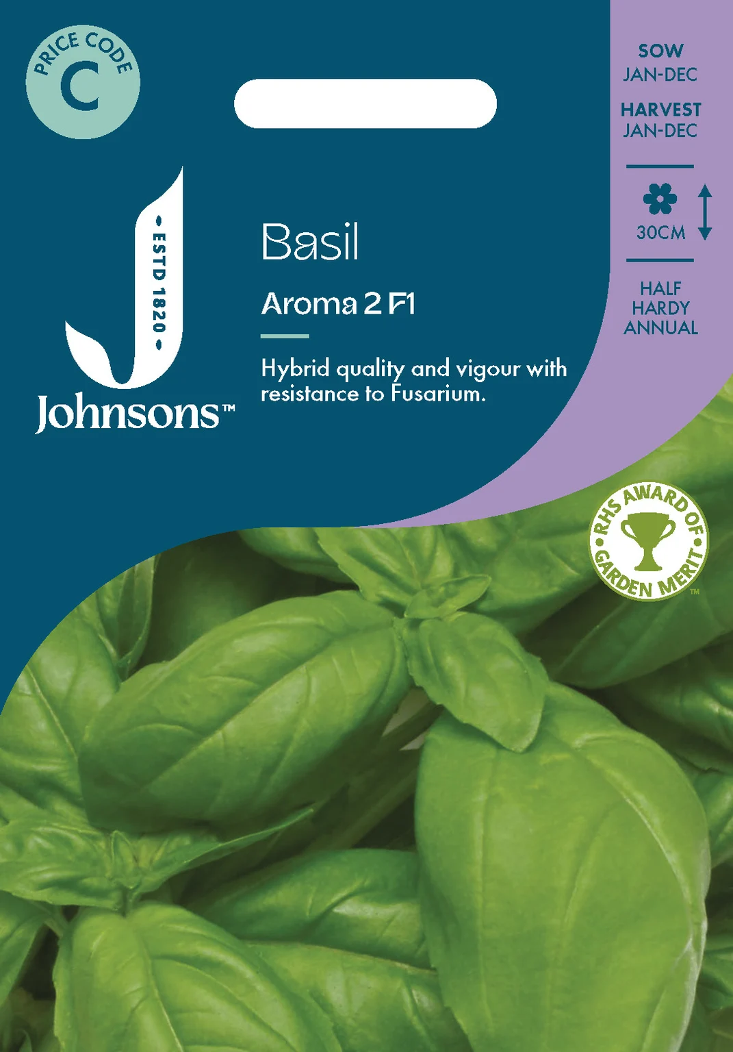 Johnsons Seeds Basil Aroma 2F1 offers glossy, aromatic leaves with a rich traditional flavor, perfect for indoor and outdoor growing. This vigorous variety resists Fusarium, bolts slowly, and thrives in pots or garden beds, ensuring fresh basil from early spring through autumn.