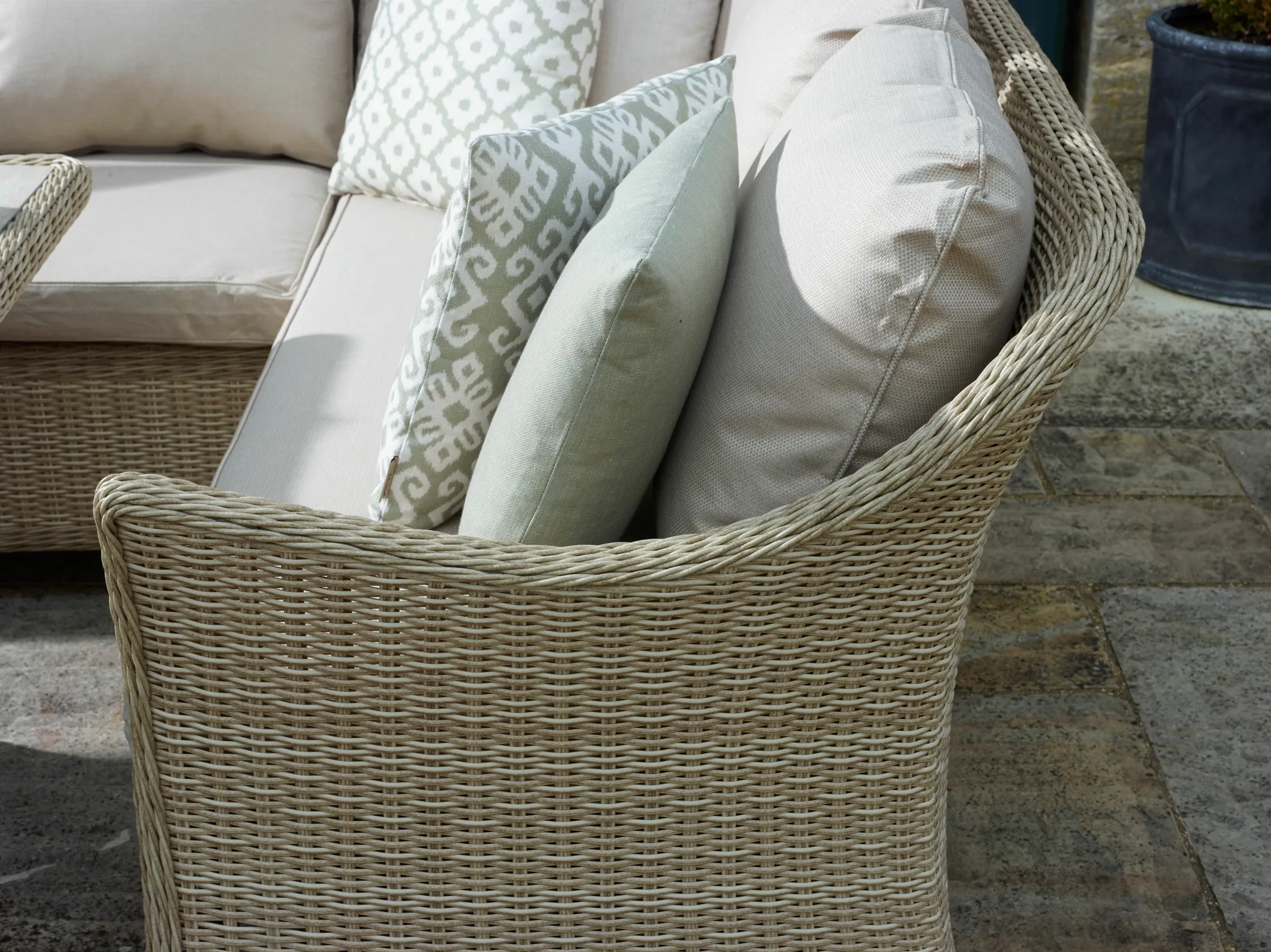 The soft-touch cushions retain the hard wearing, season-proof quality that is synonymous with our outdoor fabrics. The all-weather, Sandstone rattan is built on an aluminium frame, hence the furniture is lightweight, strong and rust-free.The highly durable, ceramic tabletop is recessed into the weave for added protection and aesthetics.