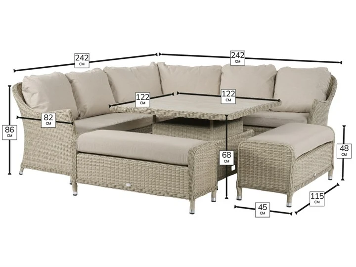 Supreme comfort and clever craftsmanship combine to form this curvaceous corner sofa set. With its clever height-changing table, you can switch from low level morning coffee mode to dining height in an instant. Sumptuous Oat coloured Eco cushions complement the soothing tones of the Sandstone rattan. Two smart padded benches lets you maximise your entertaining space without skimping on style. Oat coloured cushions are made from our innovative Eco fabric, spun from recycled plastic bottles.