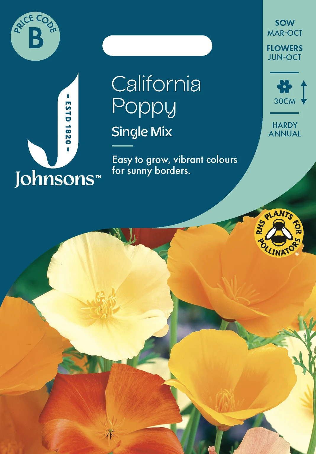 Brighten your garden with Johnsons Seeds California Poppy Single Mix, featuring drought-tolerant, delicate poppy-like blooms and feathery foliage ideal for borders and containers. Sow outdoors March to June or August to October for vibrant flowers lasting June through October, with easy care and extended flowering through multiple sowings.
