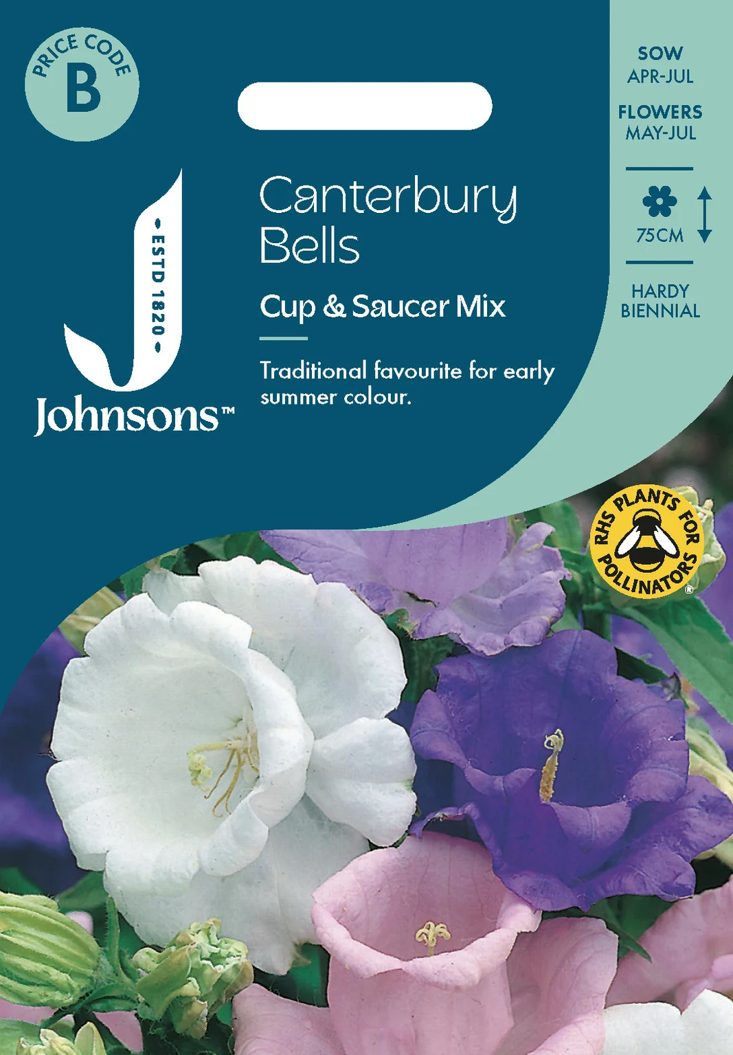 Johnsons Seeds Canterbury Bells Cup & Saucer Mix offers vibrant, large blooms perfect for early summer cottage gardens. Easy to sow outdoors from April, these charming flowers thrive with simple care, adding classic charm and color to your garden.
