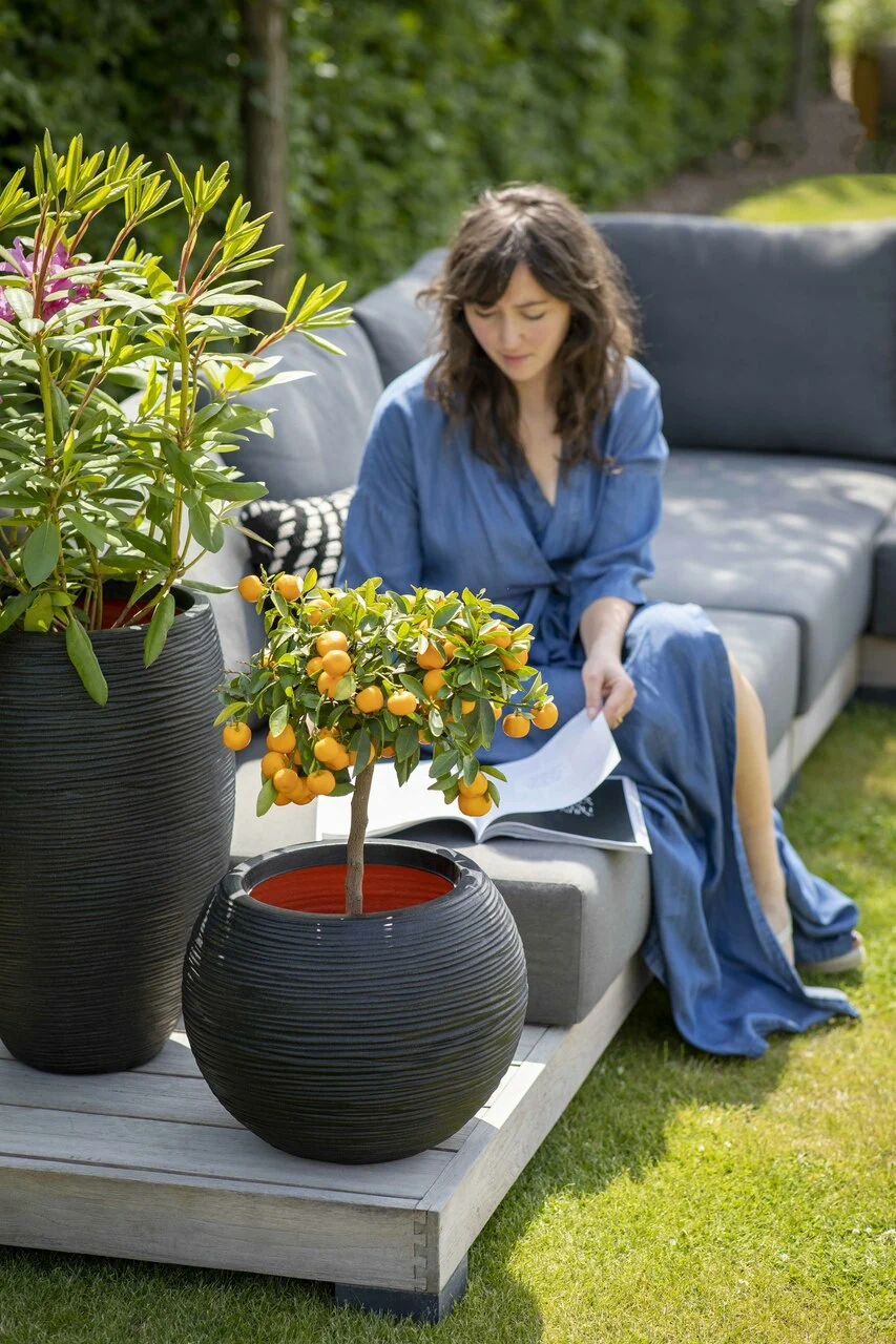 This sustainable flower pot from the Capi Nature Rib NL collection is CO2 neutral and made with recycled materials. The orange inside of the pot is a nod to Dutch production and also an insulation layer that protects the pots from frost in winter and heat in summer. This extra layer also adds strength, making this pot shatterproof. The pot is suitable for indoor and outdoor use and comes with a lifetime guarantee. The Rib texture gives this pot a natural look. This texture is inspired by braided reeds and their thin lines. The narrow, dancing lines add a playful touch to these pots in addition to a natural look.