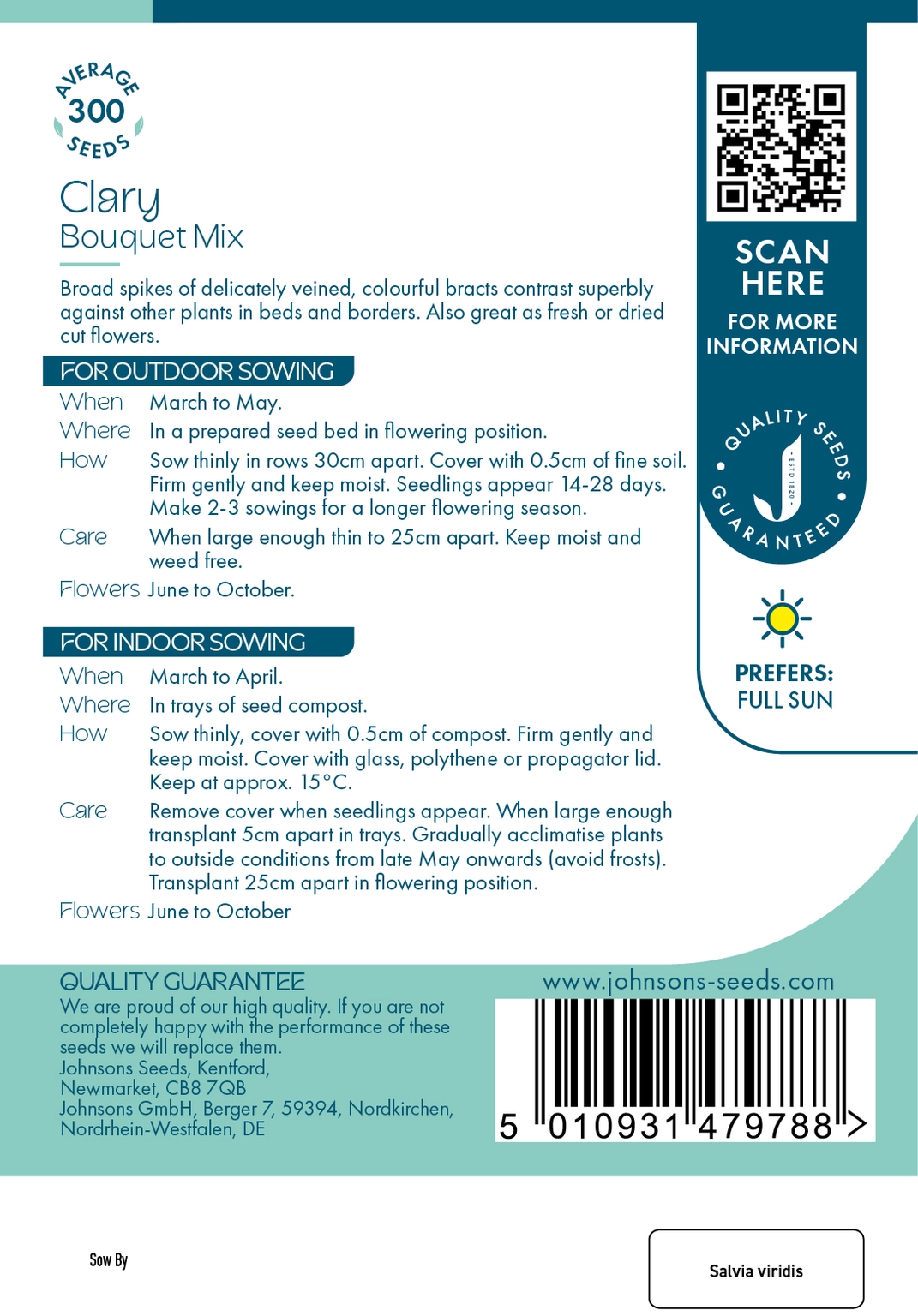 Johnsons Seeds Clary Bouquet Mix produces broad spikes of delicately veined, colourful bracts that shine in beds, borders, and cutting gardens. Reliable summer-long flowering and excellent performance as fresh or dried cut flowers make this clary sage a standout for cottage and wildlife-friendly planting.