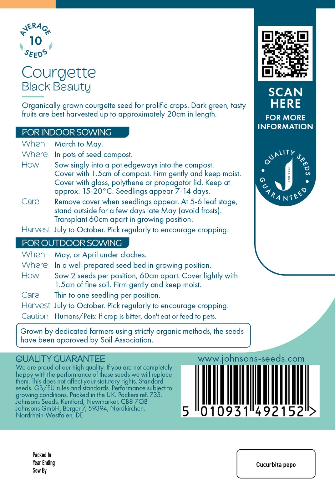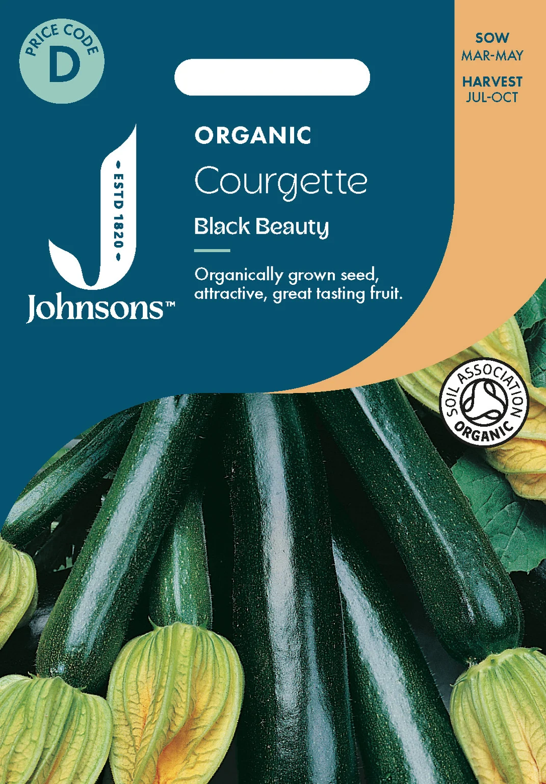 Johnsons Seeds Courgette Black Beauty delivers organically grown, dark green zucchinis known for prolific yields and rich flavor, ideal for both indoor sowing from March to May and outdoor planting from April to May. Harvest from July to October, with regular picking to maximize crop production and enjoy tender fruits up to 20cm long.