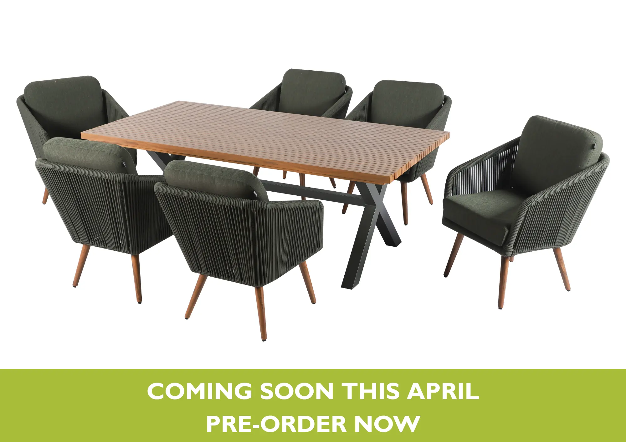 The Eden 6-Seat Dining Set combines sleek modern design with robust all-weather materials, making it an ideal choice for stylish outdoor dining. Featuring a wood-look foiled aluminium Folie tabletop that resists heat and scratches, paired with a sturdy cross-leg base, this set delivers both elegance and durability. The deep Weatherready® cushions, wrapped in weatherproof solution-dyed polyester and supported by handwoven all-weather rope over lightweight aluminium frames, ensure lasting comfort and resilience. This dining set enhances patios, gardens, or poolside areas with effortless sophistication and practical maintenance, backed by a three-year warranty extendable to five.
