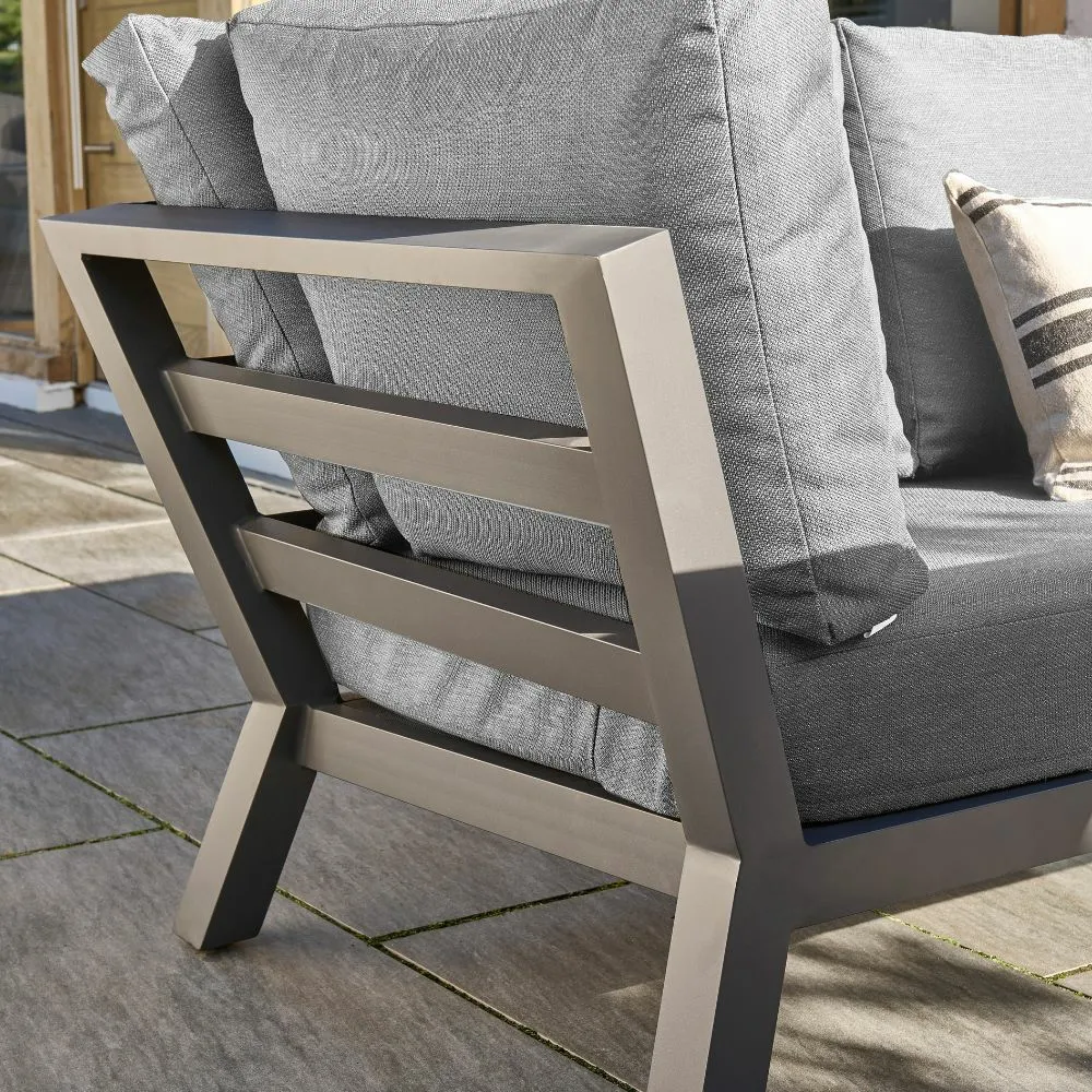 Experience pure comfort with the luxurious Timber Corner Lounge Sofa Set from the LIFE Outdoor Living Range. This designer 'L' shaped garden set is made with high-quality, rust-free aluminium in a contemporary Lava Grey powder-coating, making it completely maintenance-free. The set includes a height-adjustable table, Timber Lounge Chair, and Half Footstool, providing space for all and seating up to 7. The all-weather, Quick Dry Cushions can be left outside all year round. The set comes with a manufacturer's 5-year warranty on cushions, weave & aluminium.