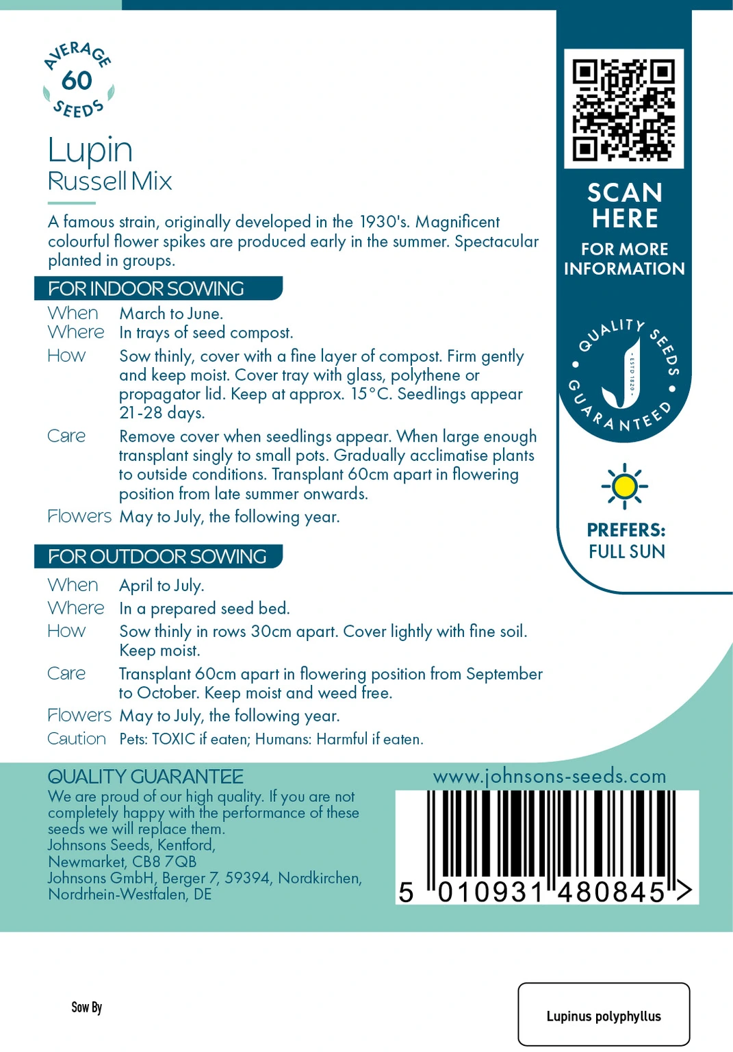 Johnsons Seeds Lupin Russell Mix delivers tall, vibrant lupin flower spikes from a classic 1930s strain, ideal for cottage gardens and bold summer borders. Best sown indoors or outdoors, these hardy perennial lupins thrive in groups, rewarding patience with striking colour from May to July.