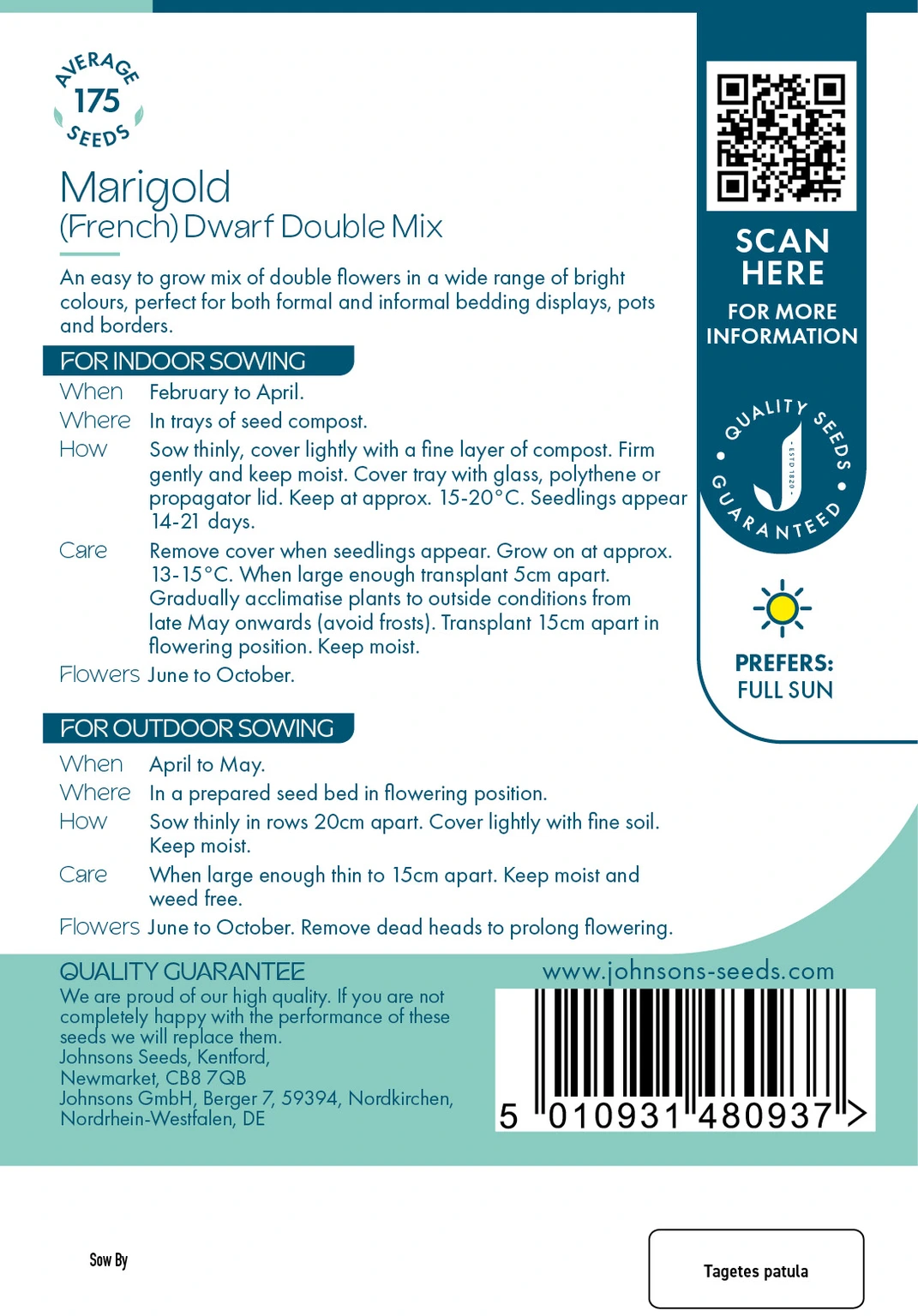 Johnsons Seeds’ Marigold (French) Dwarf Double Mix offers vibrant, easy-to-grow double blooms ideal for beds, borders, and pots. Sow indoors February-April or outdoors April-May for colourful flowers from June to October, thriving with simple care and regular watering.