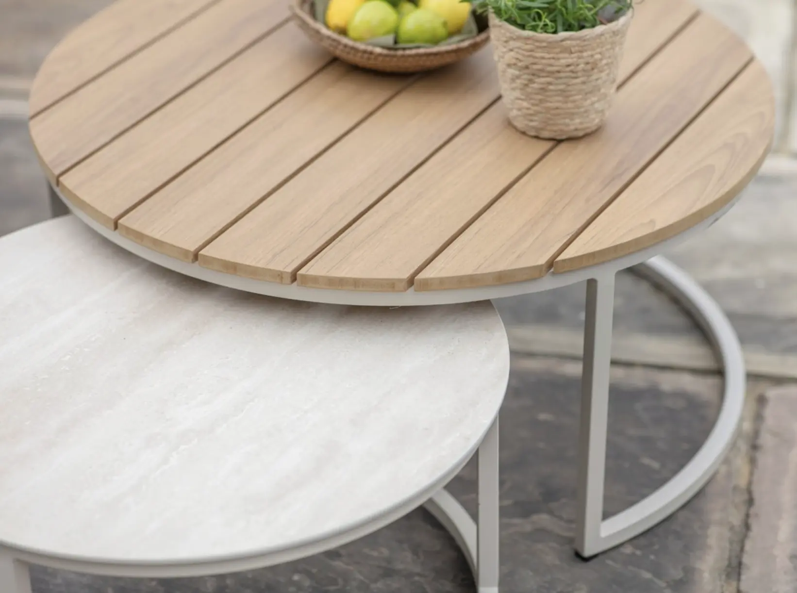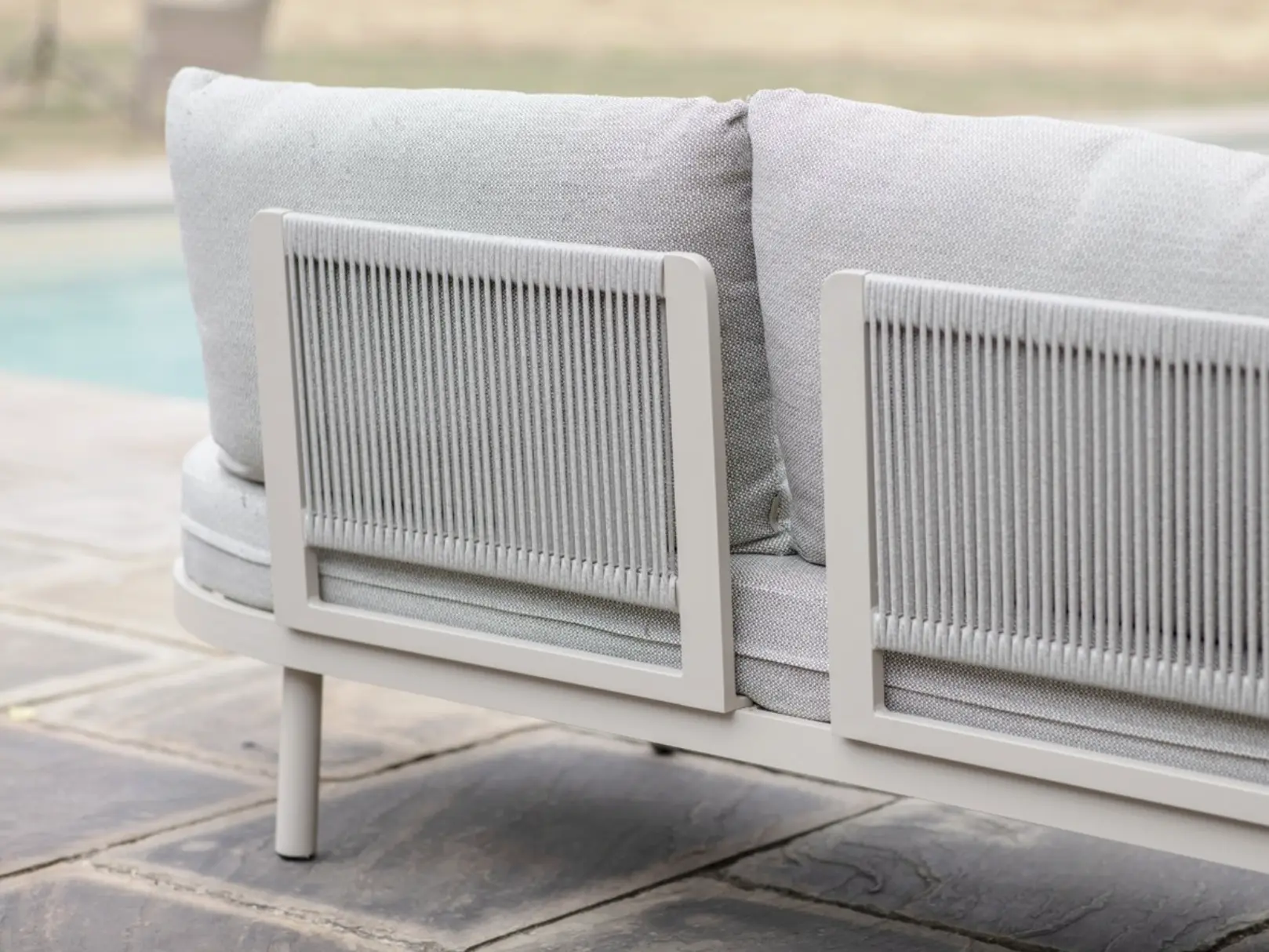 Designed for modern outdoor lounging, the Miami L-Shape Sofa with Duo Coffee Tables, Sofa Chair & Footstool pairs deep comfort with durable, weather-ready materials for stylish garden living. Lightweight aluminium frames, season-proof Eco cushions, outdoor rope detailing and mixed coffee table surfaces create a versatile garden furniture set built for everyday use and entertaining.