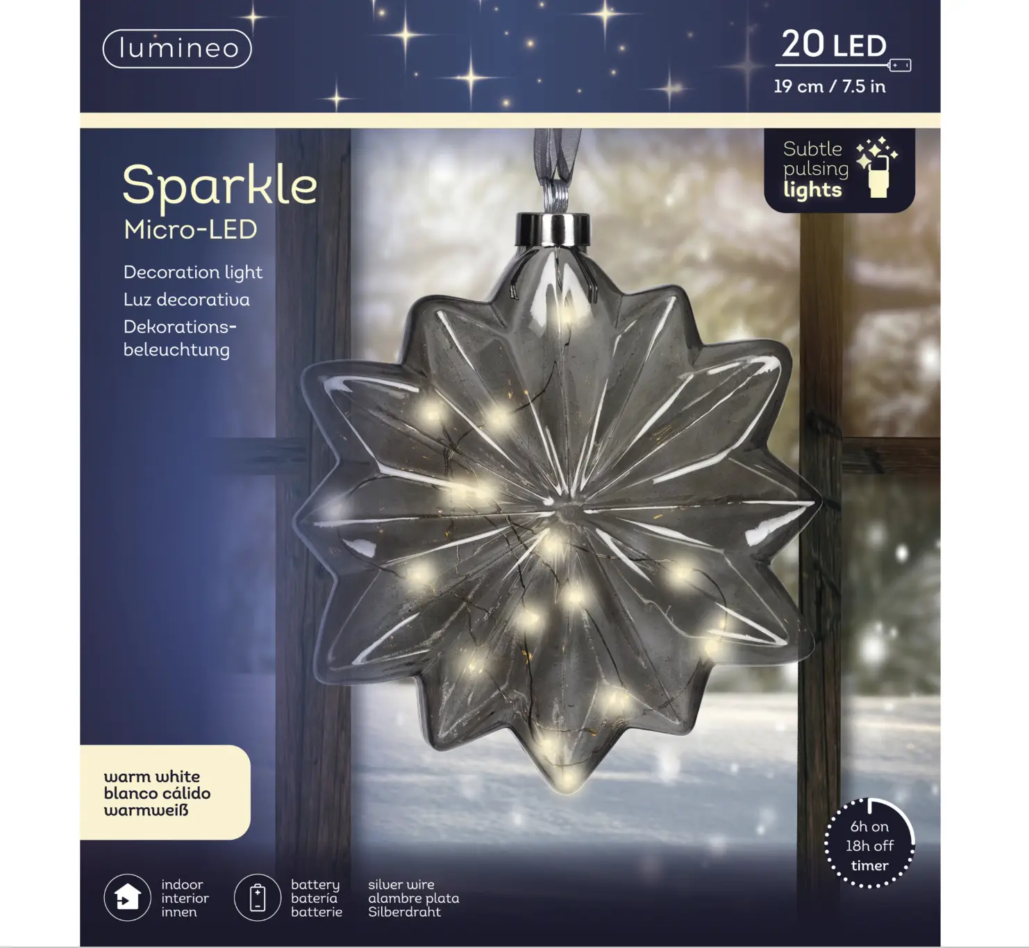 Experience a delicate glow with the micro LED flower sparkle effect, perfect for cozy indoor spaces. Finished in anthracite with warm white lighting, this glass ornament adds subtle charm and gentle illumination to your home. Ideal for mantels, shelves, or tabletops, it creates a soft, inviting ambience while catching the eye with its intricate floral design.