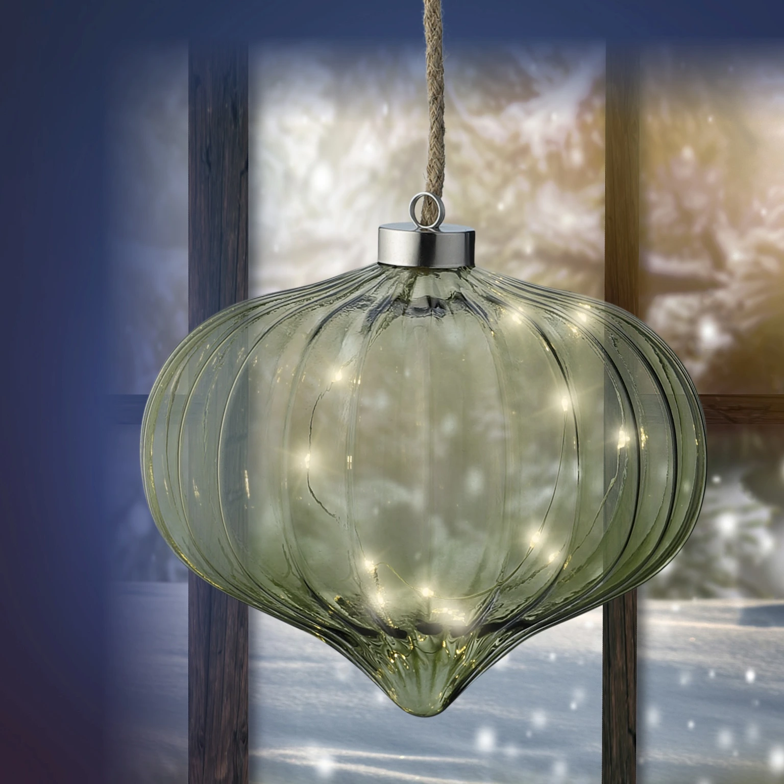 Crafted for refined interiors, the Micro LED Onion Steady BO Indoor ornament glows with subtle green or warm white hues, creating a calm and elegant ambience. Measuring dia 20 cm × H 21 cm, its glass body enhances gentle illumination, perfect for shelves, tables, or evening décor. Designed for lasting charm and modern simplicity, it suits both contemporary and classic home spaces.