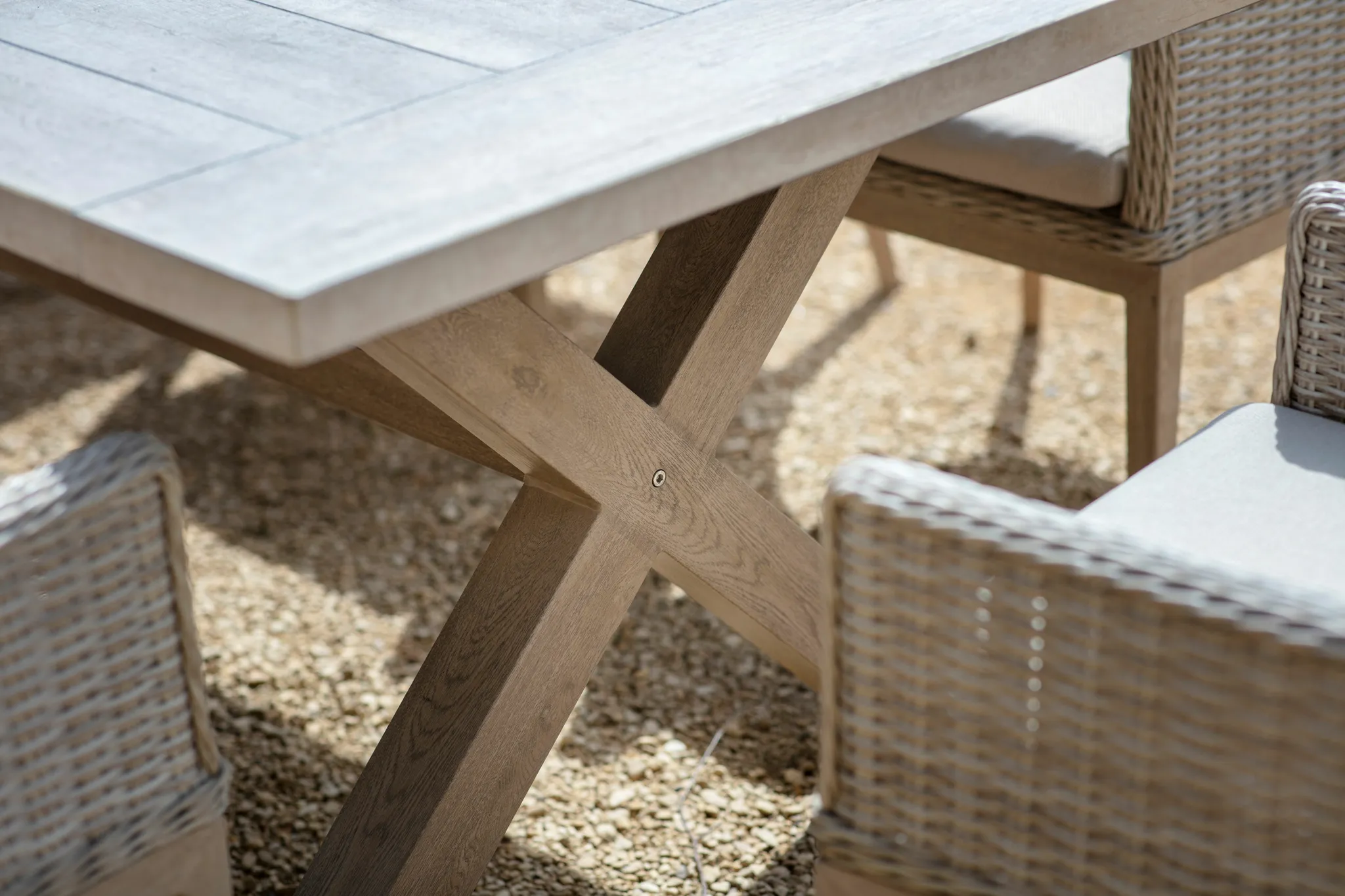 This contemporary set combines the charm of natural aesthetics with the durability and low-maintenance benefits of modern materials. With a stunning ceramic wood-effect table and elegantly curved rattan chairs, this set complements any indoor or outdoor space. The Comfortable padded chairs have removable seat and back cushions in a tasteful Oat shade, made from our innovative Eco fabric which is spun from recycled plastic bottles. They retain the hard wearing, season-proof quality that is synonymous with our outdoor fabrics and are UV resistant too.