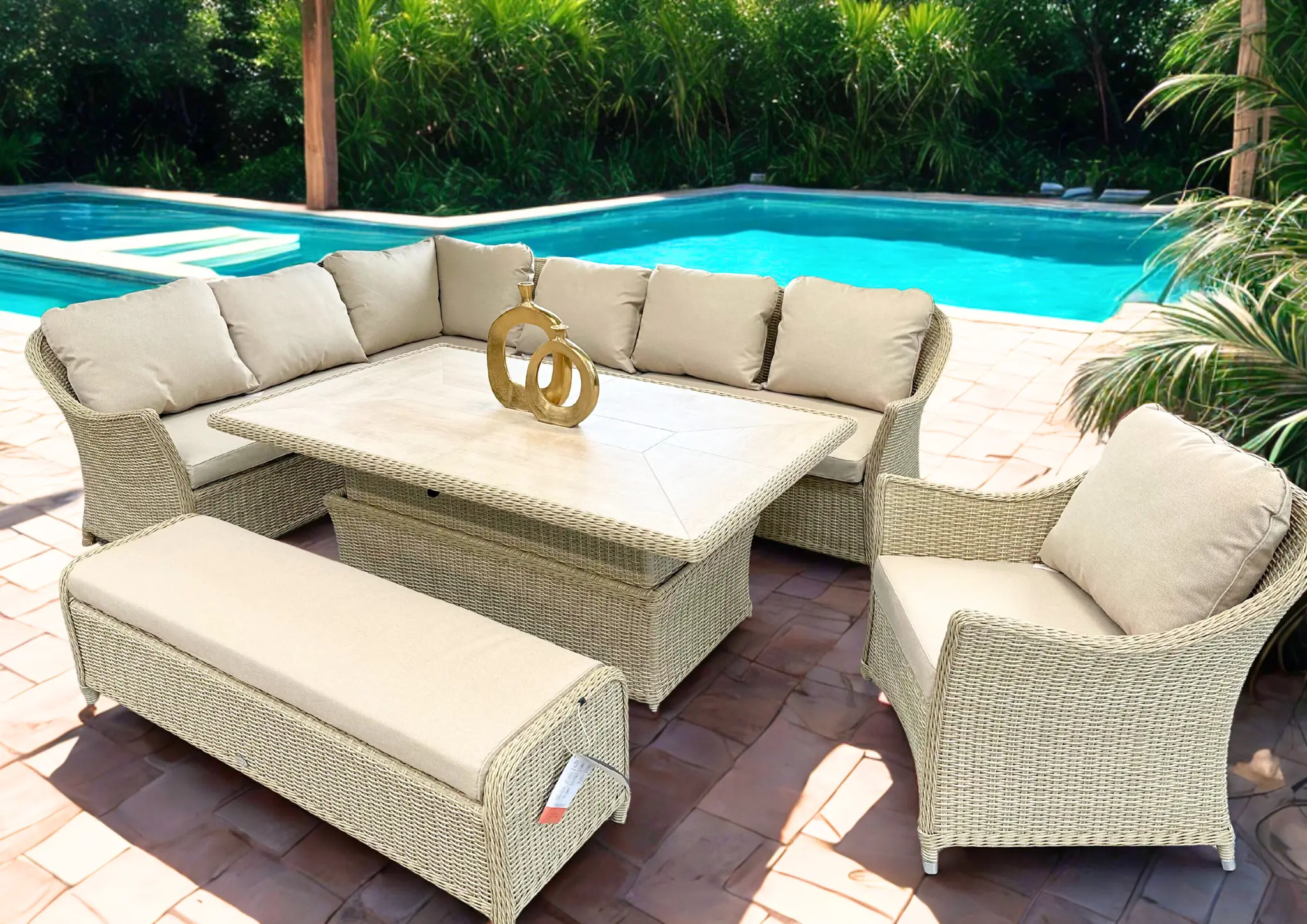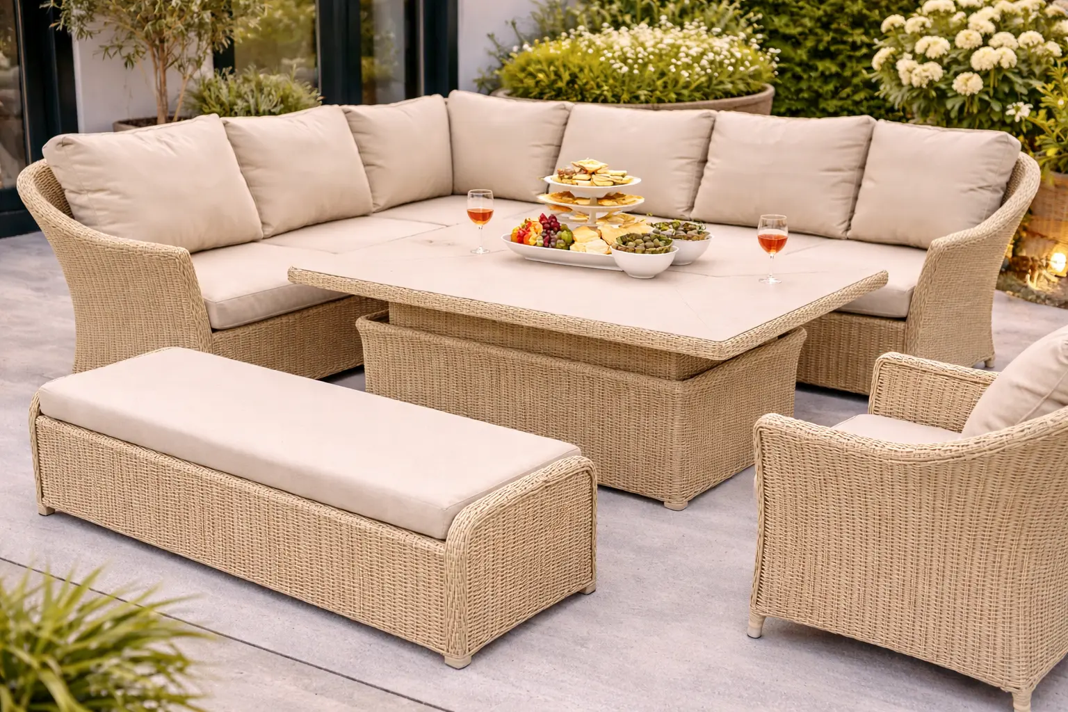 Designed for effortless outdoor entertaining, this large L sofa set pairs a spacious bench and armchair with a height-adjustable rectangular dining table and integrated firepit, creating a versatile hub for relaxed dining and late-night gatherings. Sandstone all-weather rattan on a lightweight, rust-free aluminium frame is matched with season-proof Eco cushions made from recycled plastic bottles, while the recessed, frost-resistant ceramic tabletop delivers durability, safety, and refined outdoor style.