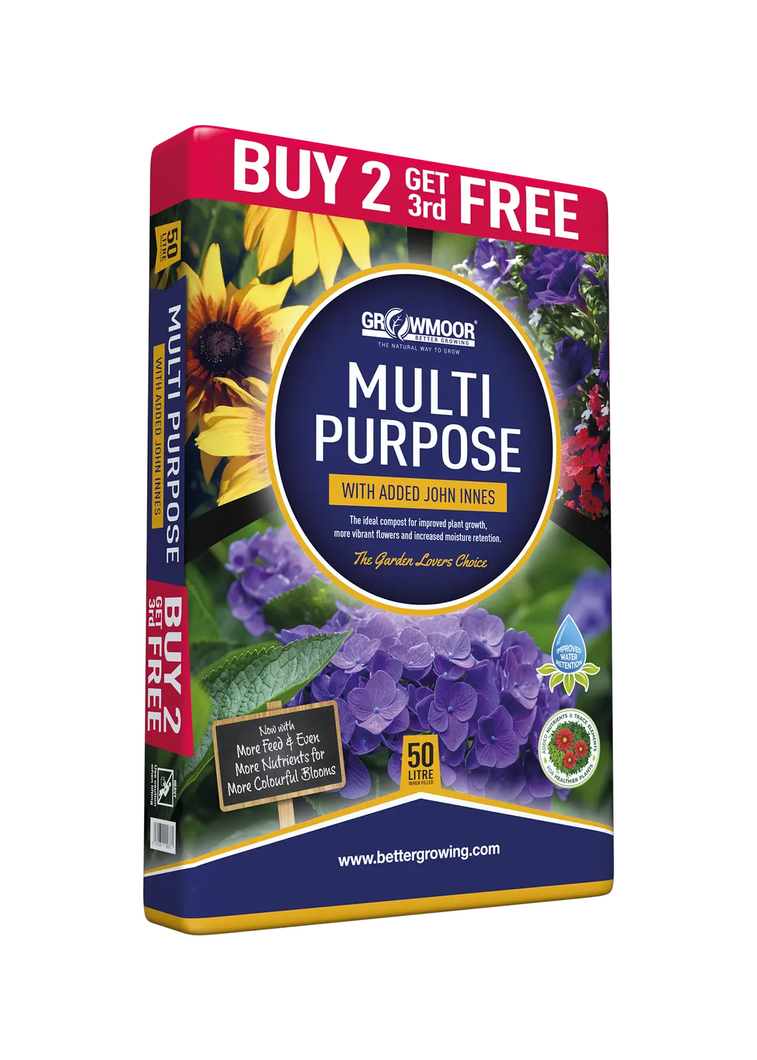 Growmoor Multi-Purpose With John Innes is an advanced nutrient-rich compost, ideal most young plants providing the correct growing conditions for optimum growth. It contains loam (John Innes), formulated to hold water and nutrients for longer, protecting plants from under or overfeeding by releasing nutrients when needed. Multi-Purpose Compost with added John Innes is also much easier to re-wet after drying and remains moist for longer after watering.