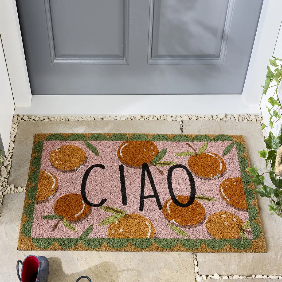 My Mat Printed Coir Ciao Orange offers durable, eco-friendly coconut husk fibres that efficiently trap dirt and mud while adding a vibrant touch to your doorway. Featuring a playful orange print with a green scalloped border, this stylish coir mat blends functionality with eye-catching design for any home.