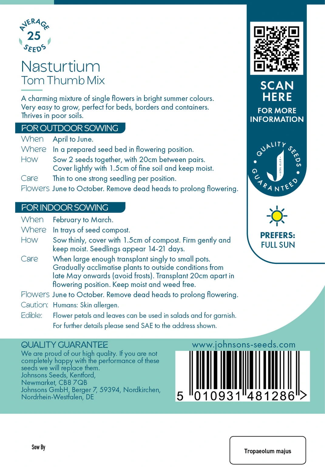 Nasturtium Tom Thumb Mix by Johnsons Seeds offers vibrant, easy-to-grow flowers perfect for beds, borders, and containers, thriving even in poor soils. Sow outdoors from April to June or indoors from February to March for stunning blooms from June to October, with edible petals that add a fresh, colourful touch to salads.