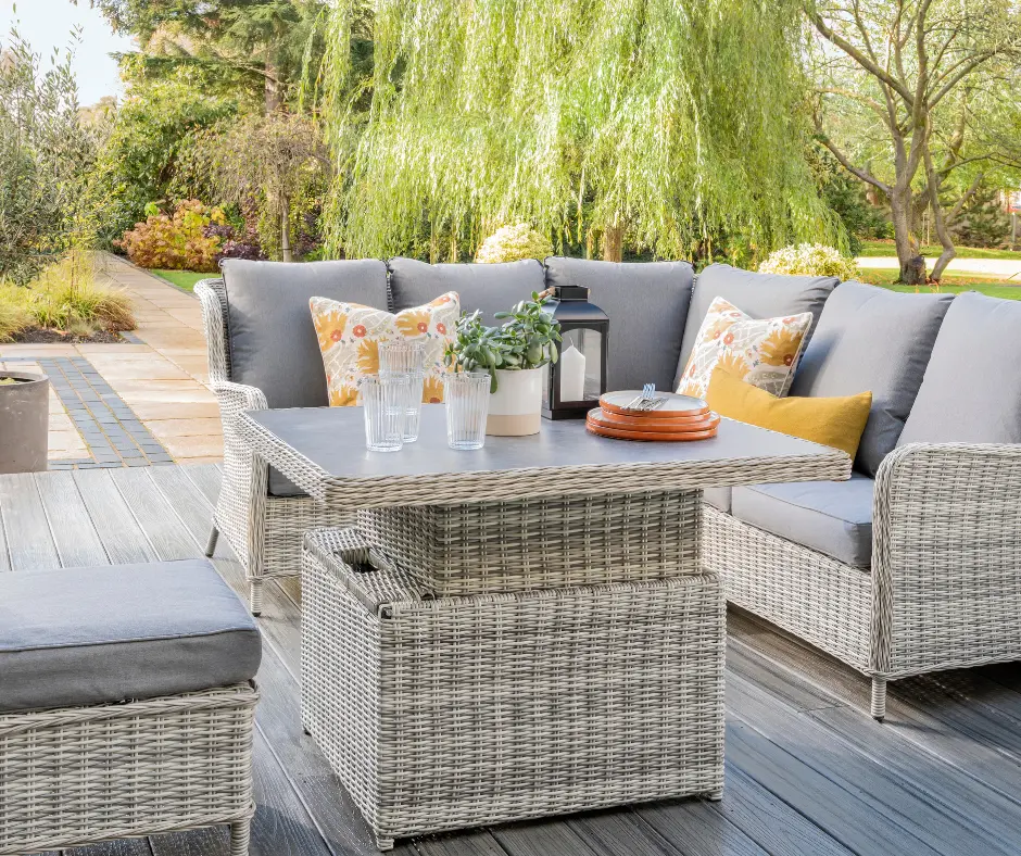 Nevada Delux Mini Corner offers a compact height-adjustable table paired with two small stools, ideal for cosy indoor corners or intimate outdoor spaces. Handwoven in beige and grey tones, the set features a durable aluminium frame, UV-protected weave, and soft grey cushions for comfort. The ceramic tabletop is scratch-resistant, weatherproof, and easy to clean, while the adjustable table height provides flexibility for dining, working, or relaxing. Perfect for small gardens, patios, or living areas seeking a stylish yet practical seating solution.