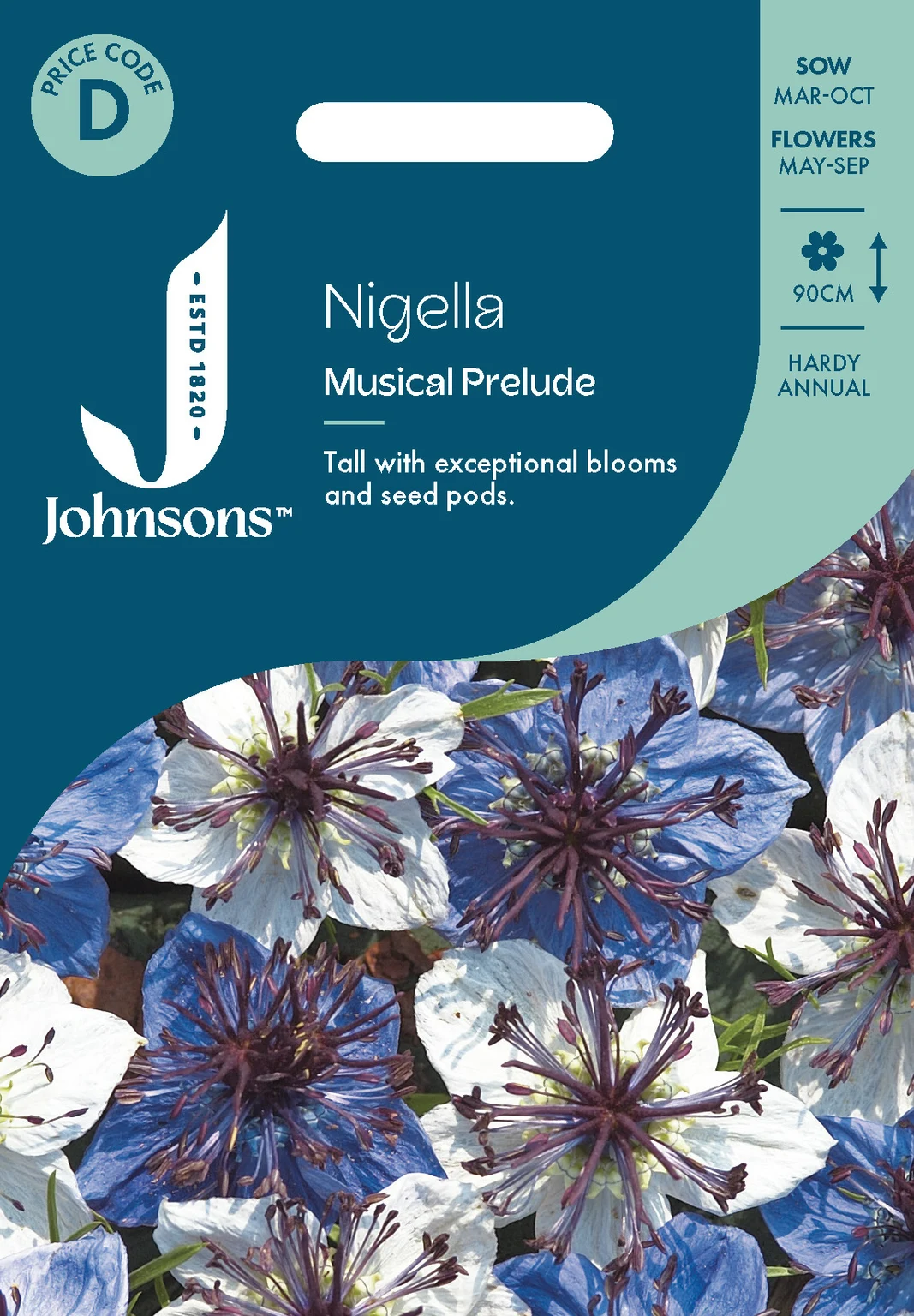 Striking Nigella 'Musical Prelude' from Johnsons Seeds offers eye-catching blooms with unique seed pods, perfect for vibrant borders and stunning fresh or dried floral arrangements. Sow thinly outdoors from March to May or August to October for continuous flowering from May through September.