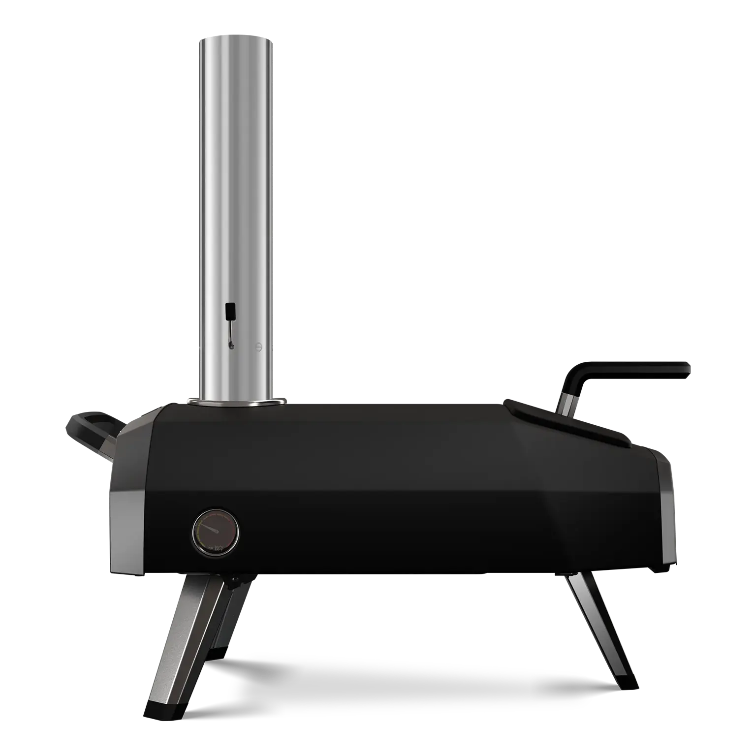 The Ooni pizza oven can be used with wood, charcoal, or gas.