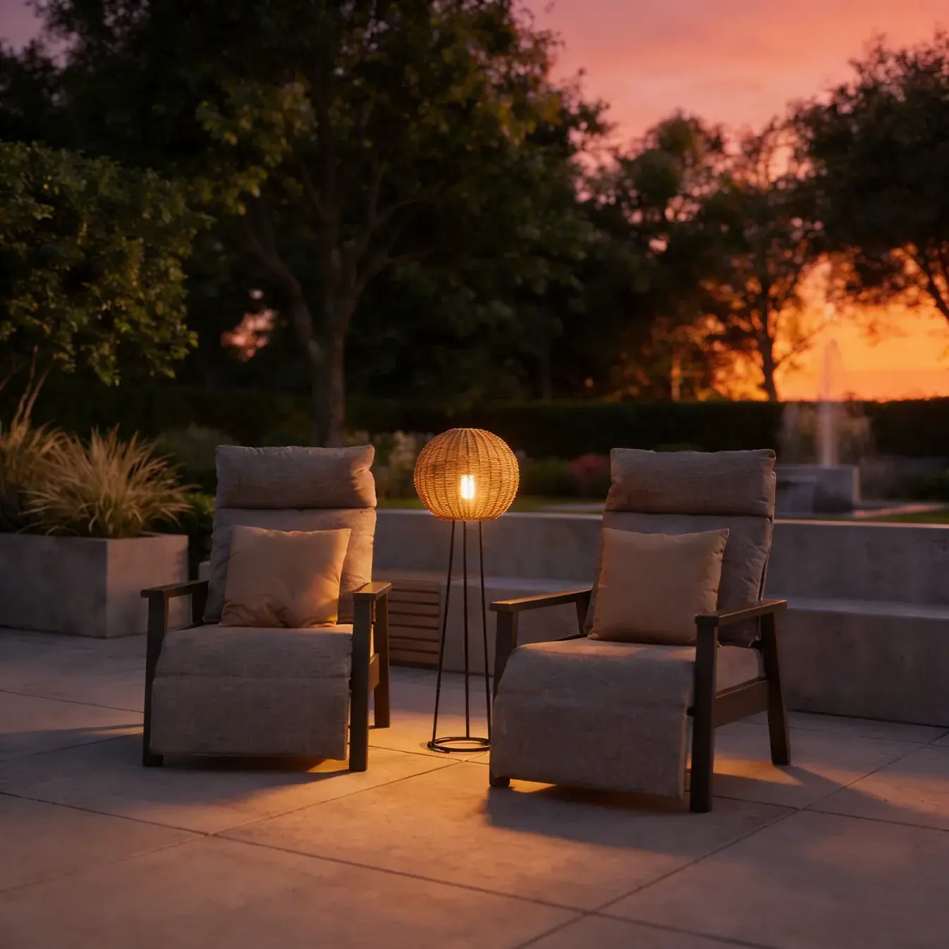 The Orta Sesame Rattan Floor Lamp is a premium outdoor floor lamp designed for patios, decks, and garden lounges, delivering warm ambient lighting with a sophisticated, contemporary aesthetic. Crafted from UV-resistant rattan and powered by a rechargeable Magbulb, this 120cm cordless exterior light offers remote control convenience, natural warm colour quality, and seamless indoor-outdoor style as part of the Lumé outdoor lighting collection.