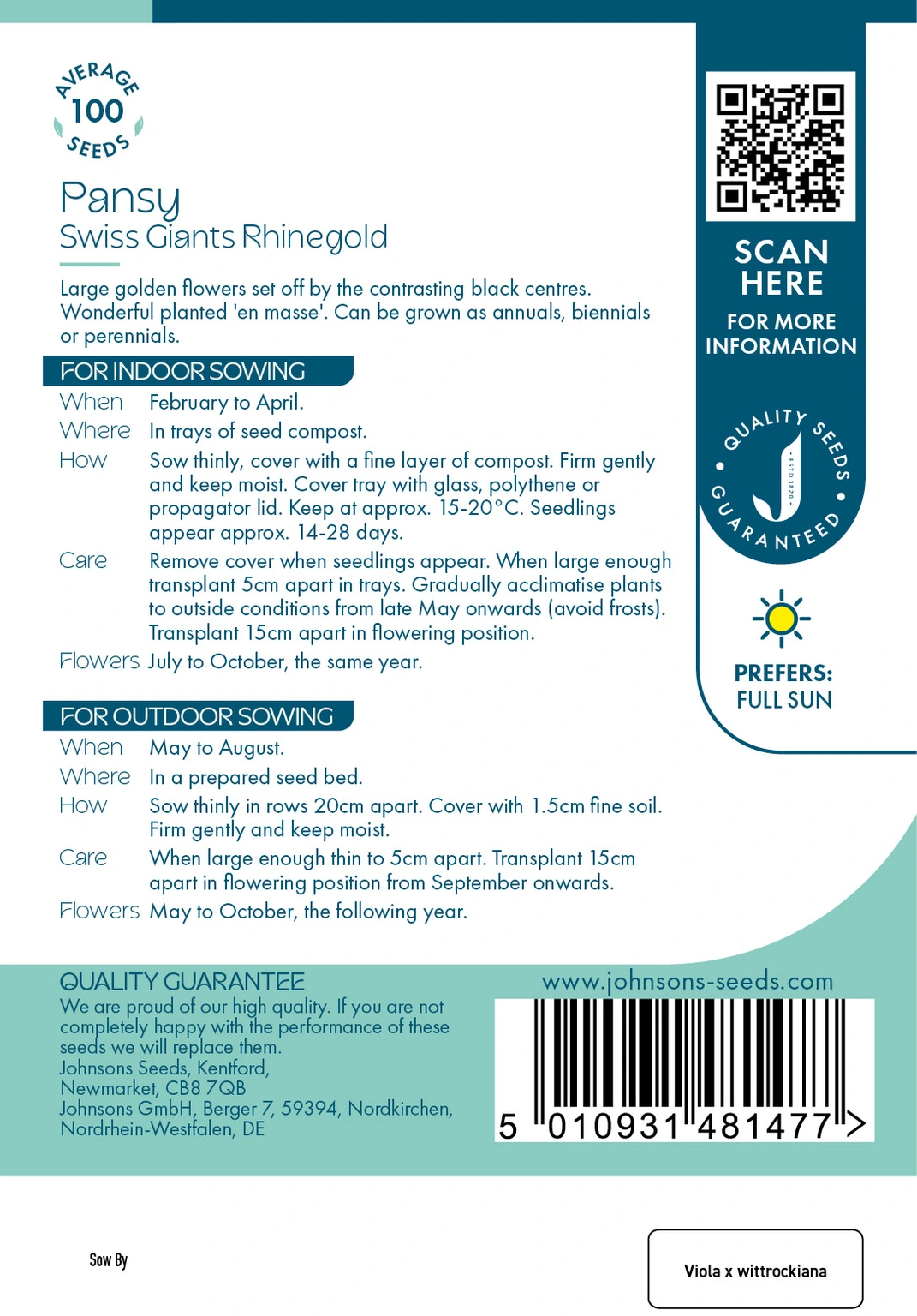 Johnsons Seeds Pansy Swiss Giants Rhinegold delivers large golden-yellow blooms with striking black centres, creating bold impact when planted en masse in beds, borders, or containers. Reliable and versatile, this pansy thrives as an annual, biennial, or perennial, flowering generously from summer through autumn or the following spring.