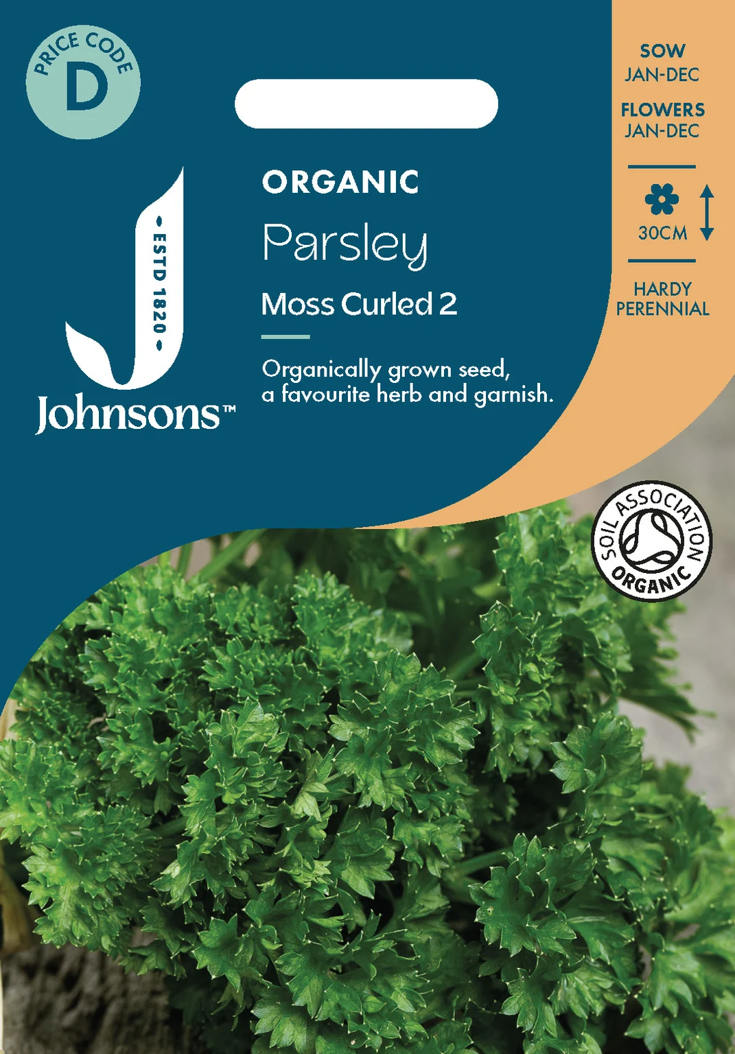 Johnsons Seeds Parsley Moss Curled 2 delivers finely curled, aromatic leaves from organically grown seed, ideal for salads, sauces, fish and egg dishes. Packed with vitamin C and iron, this reliable parsley variety thrives in gardens or pots with long, productive harvests.