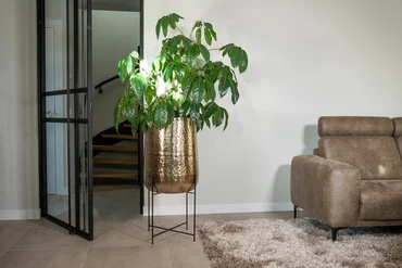 Pot On Foot Carly Gold adds a touch of luxury to any space with its stunning gold finish and sleek black metal stand. Designed by Dutch brand TS Collection. Perfect for homes with high ceilings. Whether showcasing a lush Strelitzia, a stylish Kentia palm, or minimalist cacti, Carly transforms interiors with elegance. Even without a plant, its exquisite craftsmanship makes it a standout decorative piece.