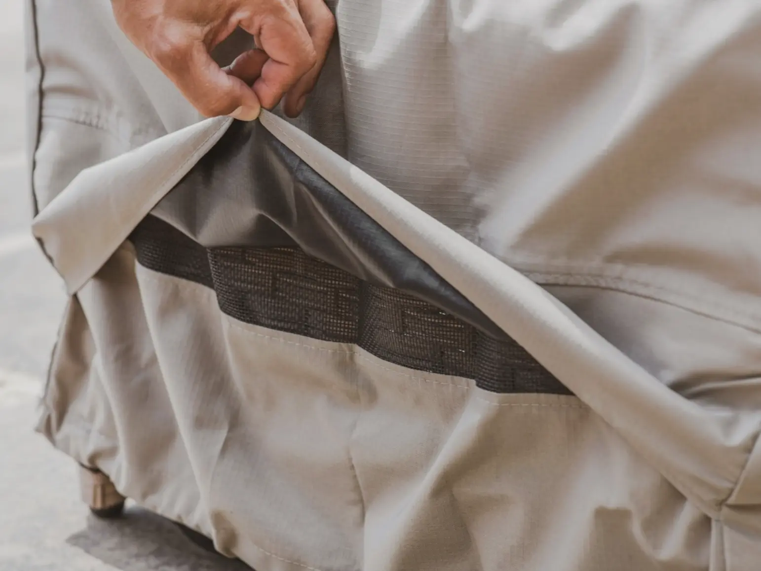 Durable rectangle firepit table cover crafted from 300 denier ripstop polyester, delivering water-resistant, UV50+ protection with breathable vents for year-round outdoor furniture care. Secure fastenings, sealed seams, and colourfast khaki fabric ensure reliable all-weather defence with minimal maintenance.
