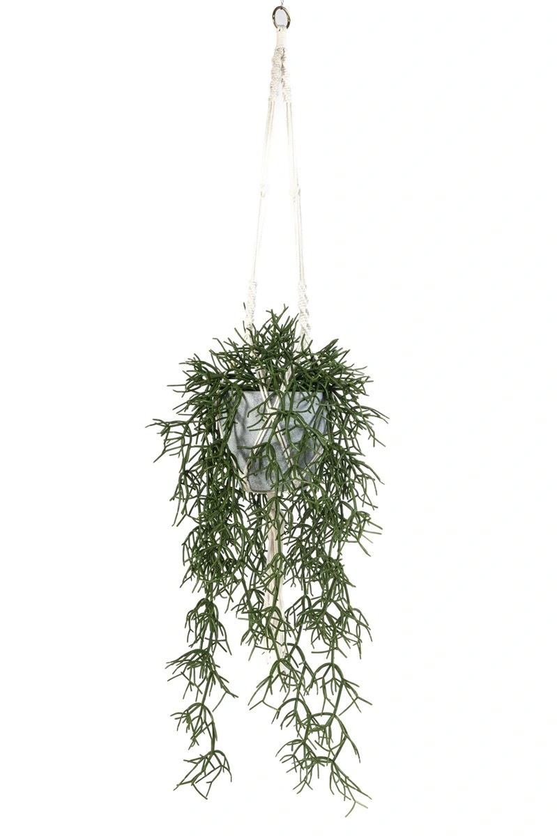 Lifelike Rhipsalis faux plant in hanging pot offers effortless greenery with cascading stems that mimic natural growth. Ideal for home or office décor, this low-maintenance artificial hanging plant adds texture and depth without watering or sunlight. Crafted for durability and realism, it’s perfect for modern interiors seeking long-lasting style.