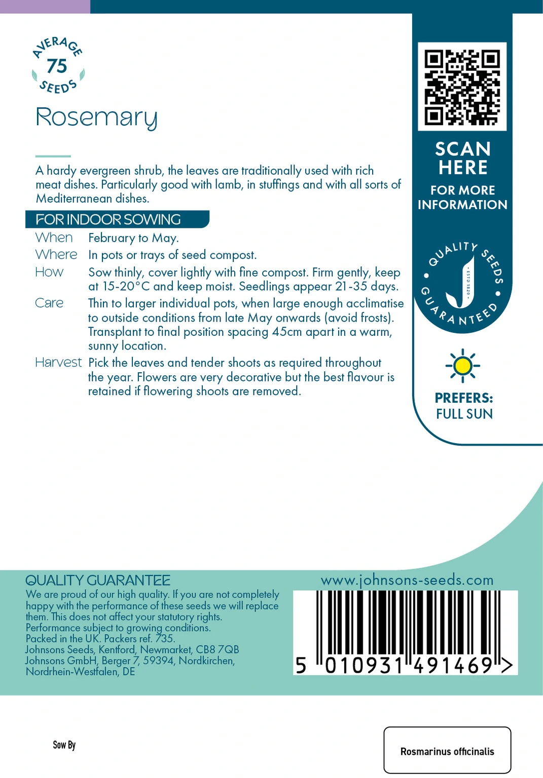 Johnsons Seeds Rosemary is a resilient evergreen herb perfect for indoor sowing from February to May, ideal for enriching Mediterranean and lamb dishes with its aromatic leaves. Sow thinly in pots or trays at 15-20°C, transplant outdoors after frost risk fades, and enjoy year-round harvests of fresh, flavorful shoots.