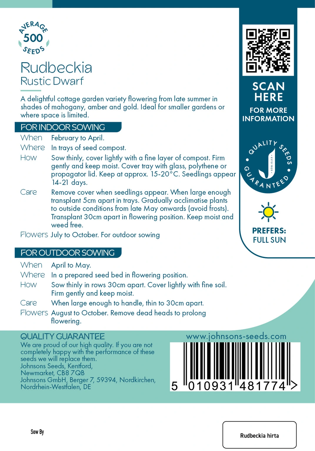 Johnsons Seeds Rustic Dwarf Rudbeckia is perfect for compact gardens, blooming vibrant mahogany, amber, and gold flowers from late summer. Easy to grow indoors from February to April or outdoors from April, this hardy variety thrives with minimal care, adding warm color to small spaces.