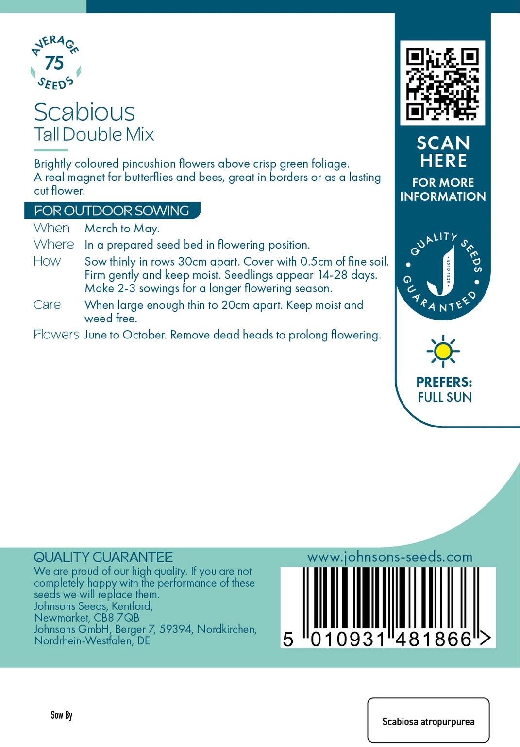 Johnsons Seeds Scabious Tall Double Mix produces vibrant, double pincushion flowers that attract bees and butterflies while delivering long-lasting colour for borders and cut flower displays. Easy to grow from outdoor sowing, this hardy annual rewards gardeners with continuous blooms from early summer through autumn.