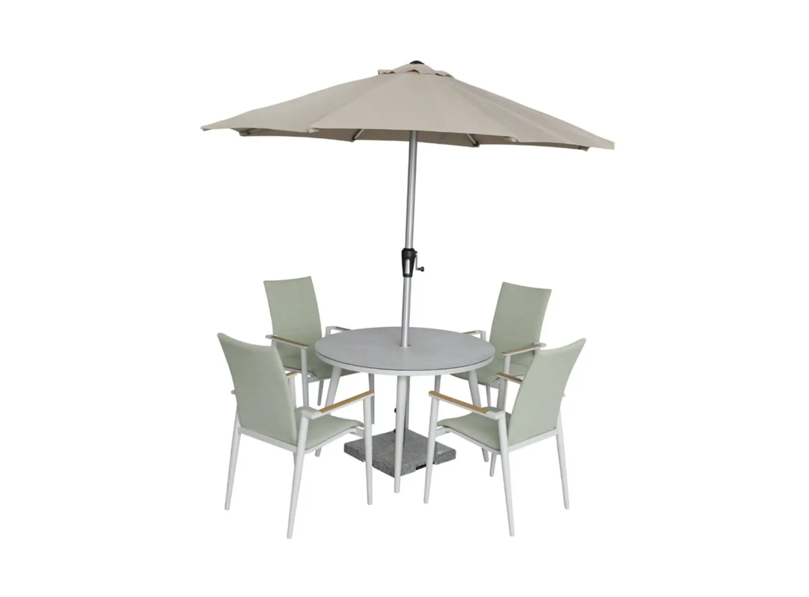The Sofia Round Table with 4 Deluxe Armchairs, Parasol & Base Set in Green is crafted for stylish, durable outdoor living. Featuring a 110cm round ceramic glass table and padded Textilene chairs, this set combines breathable comfort with a lightweight, rust-free aluminium frame built to withstand all seasons. The coordinating parasol provides flexible shade, while stackable chairs offer a space-saving solution for easy storage. With UV and frost resistance plus a 5-year structural guarantee, this low-maintenance dining set is perfect for year-round garden enjoyment.