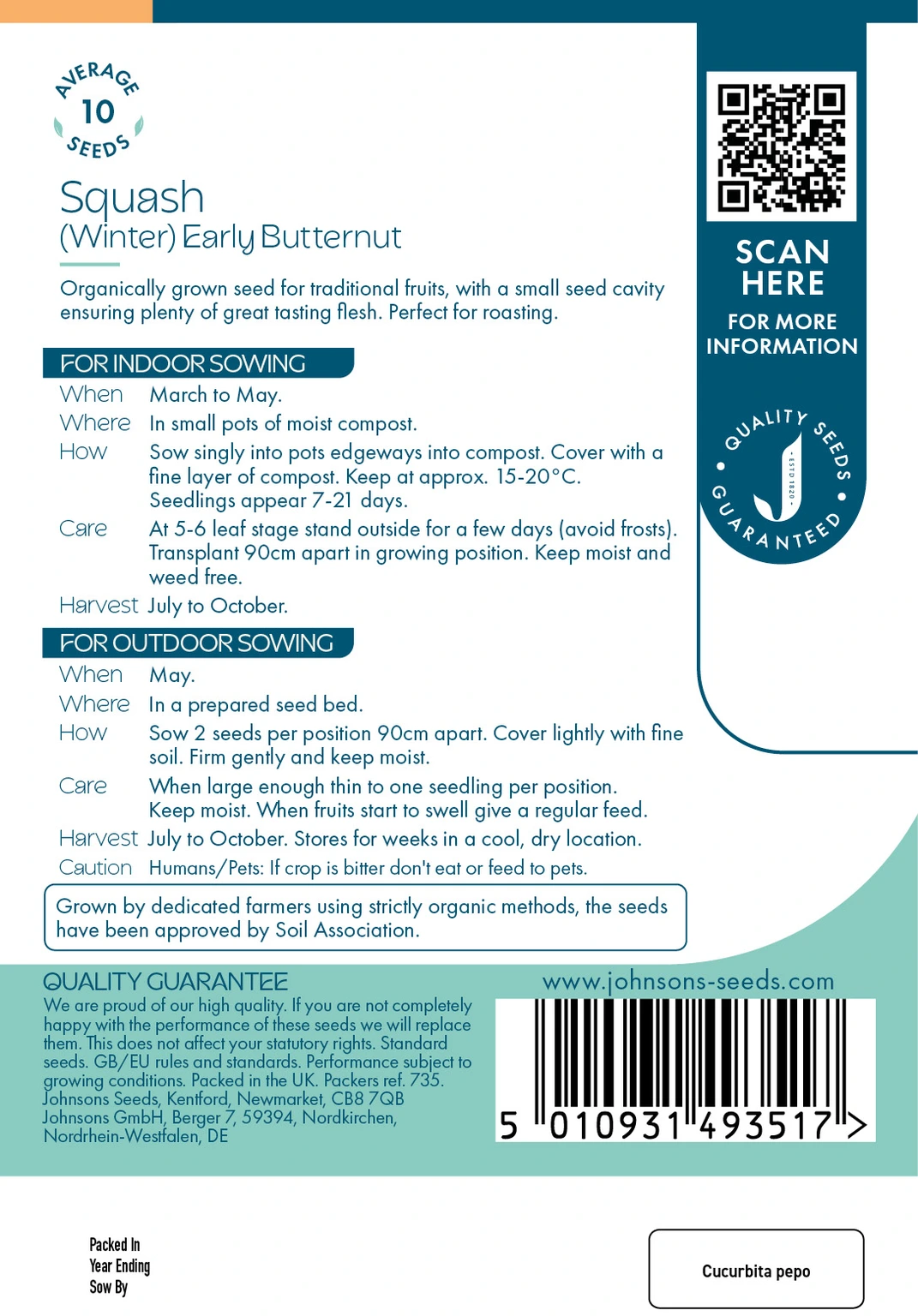 Organically grown Johnsons Seeds Winter Squash Early Butternut produces reliable, high-yielding plants with smooth, sweet-flavoured fruits and a small seed cavity for maximum flesh—ideal for roasting, soups, and winter storage. Easy to grow indoors or outdoors, this butternut squash offers excellent disease resistance, long keeping quality, and consistent harvests from summer to autumn.