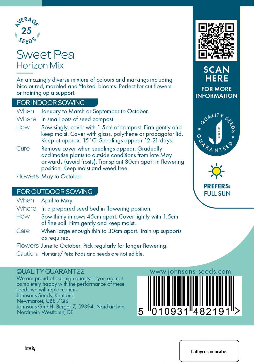 Johnsons Seeds Sweet Pea Horizon Mix offers a stunning array of vibrant, multicolored blooms—bicoloured, marbled, and flaked—ideal for cut flowers or climbing supports. Sow indoors from January to March or September to October, or outdoors from April to May, for a long flowering season from May through October.
