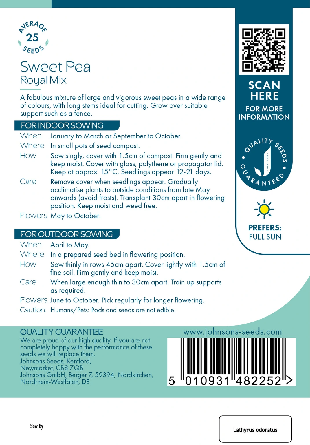 Johnsons Seeds Sweet Pea Royal Mix offers a vibrant blend of large, vigorous flowers in diverse colors with long stems, perfect for cutting and growing on supports like fences. Ideal for indoor or outdoor sowing, these easy-care sweet peas bloom from May to October, brightening gardens with continuous, fragrant blooms.