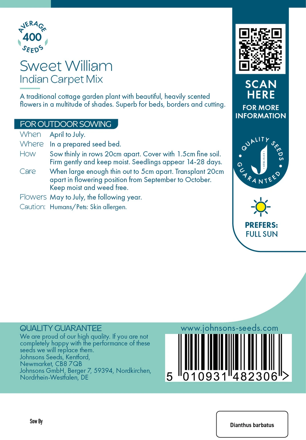 Johnsons Seeds Sweet William Indian Carpet Mix produces richly scented, vibrant flowers ideal for beds, borders, and cuttings. This hardy outdoor sowing variety thrives with easy care, blooming from May to July to bring classic cottage charm to your garden.