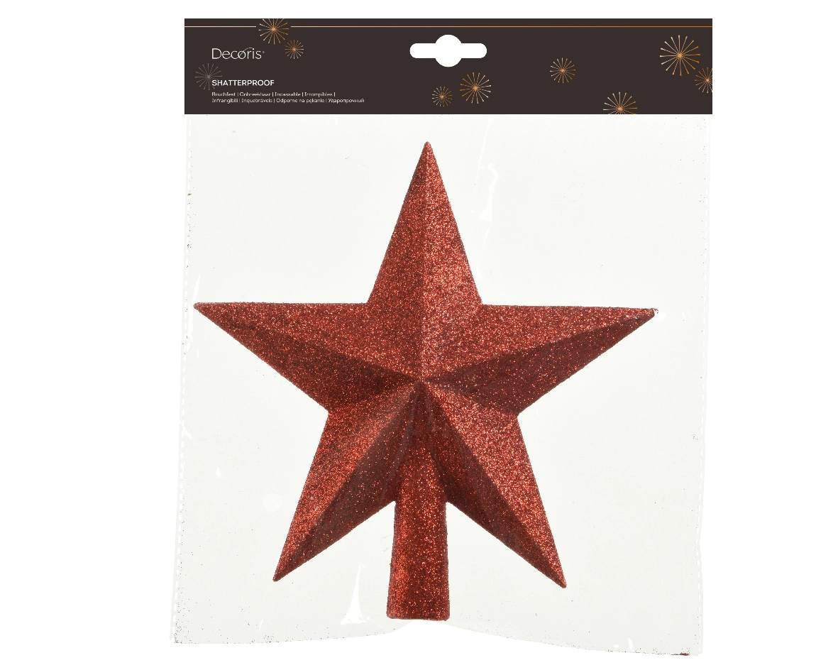 Beautifully decorate your tree with this glitter shatterproof treetopper in Christmas red,