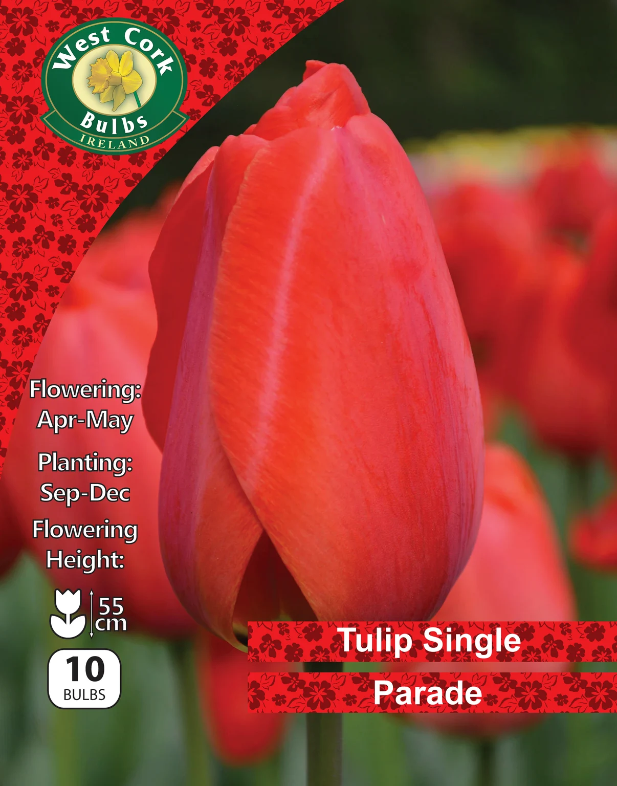 Add vibrant colour to spring borders with Tulip Darwin Hybrid 'Parade', a classic variety renowned for its bold red blooms and strong stems. These premium quality autumn bulbs from West Cork Bulbs are perfect for planting in beds, borders, or containers, offering reliable flowering year after year. Their large, goblet-shaped flowers make a striking statement in any garden display.
