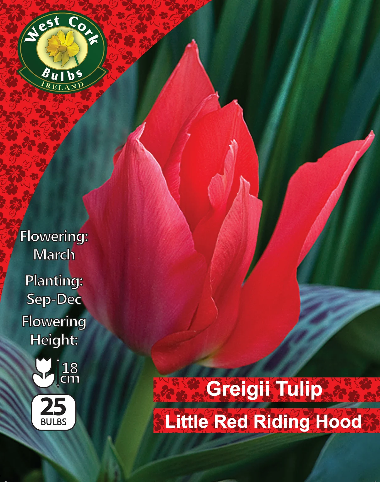 Ignite your spring borders with the fiery Tulip ‘Little Red Riding Hood’ autumn bulbs. This 25-bulb pack (10/11 cm) delivers bold cherry-red petals edged in jet-black, creating a dramatic focal point from April through May. Hardy in USDA zones 3–8, these bulbs thrive in well-drained soil and full sun, promising a reliable burst of color year after year.